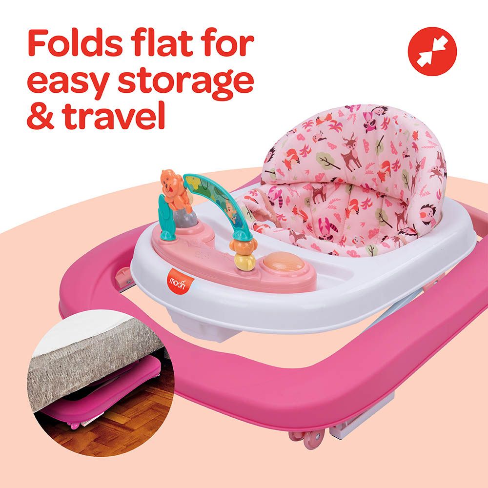 The Moon Stride baby walker also comes with a removable musical tray which can be used as food tray after your baby'ss play break, making it easy to keep your baby fed while they learn to walk. Whether you're looking to help your baby take their first steps or give them a fun activity to do, the Moon Stride baby walker is the perfect choice! Plus, when not in use, it easily folds for compact storage.
