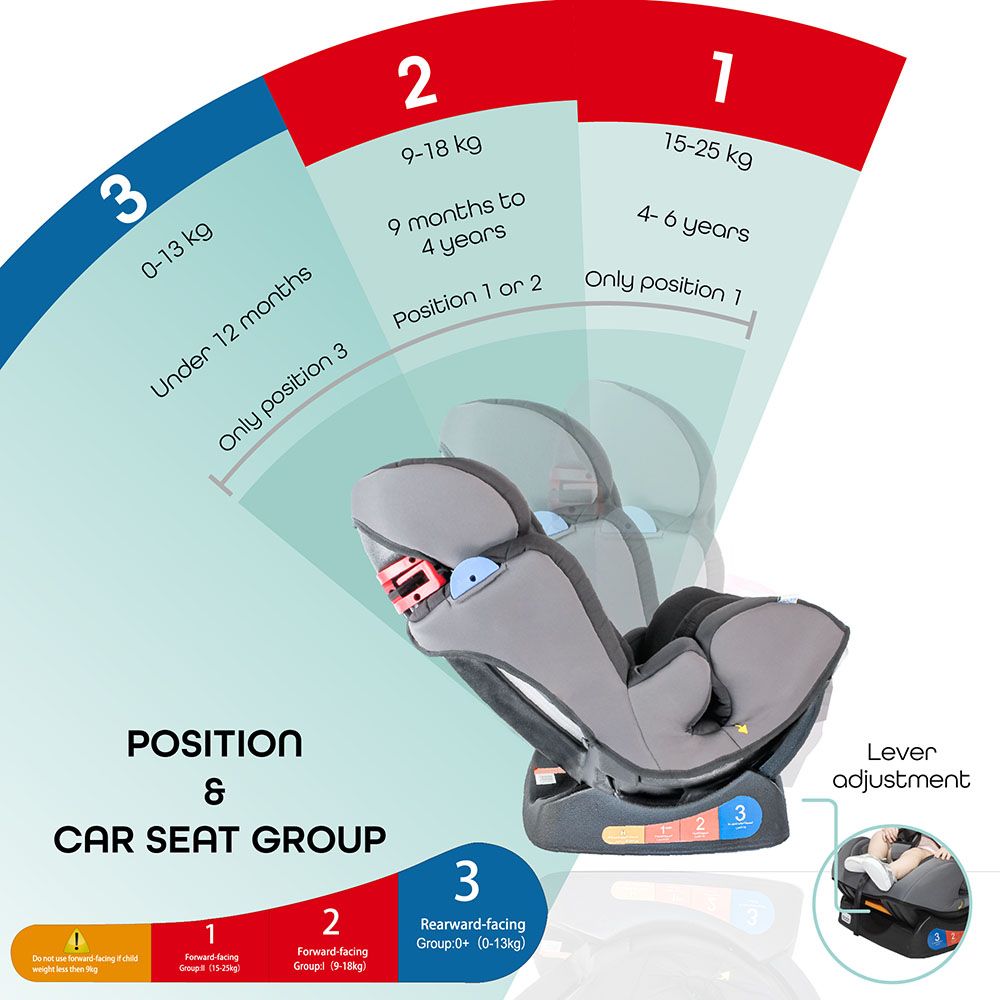 - Rear-faced highest safety adjustment for group 0+ infants under 12 months (0-13kg)