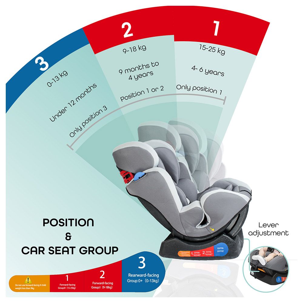 - Rear-faced highest safety adjustment for group 0+ infants under 12 months (0-13kg)