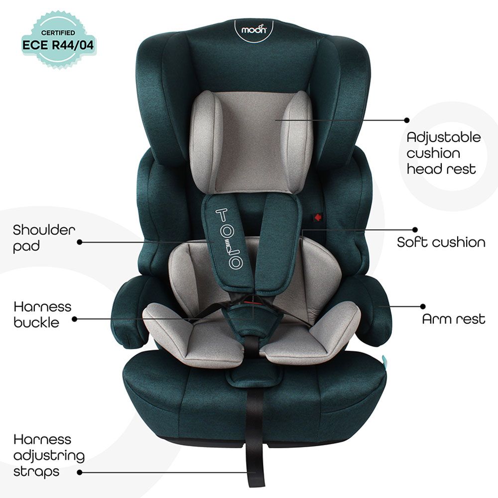 - Multi-Stage Car Seat: Made with longevity in mind, the MOON Tolo baby car seat is a high-quality option for groups 1-2-3. This convertible, multi-stage safety system is built to the greatest standards and will last from the time your child is 9 months to 12 years old