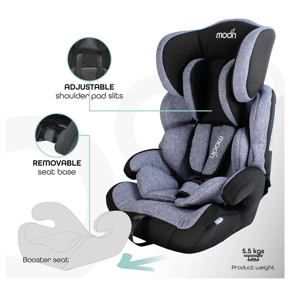 - Multi-Stage Car Seat: Made with longevity in mind, the MOON Tolo baby car seat is a high-quality option for groups 1-2-3. This convertible, multi-stage safety system is built to the greatest standards and will last from the time your child is 9 months to 12 years old