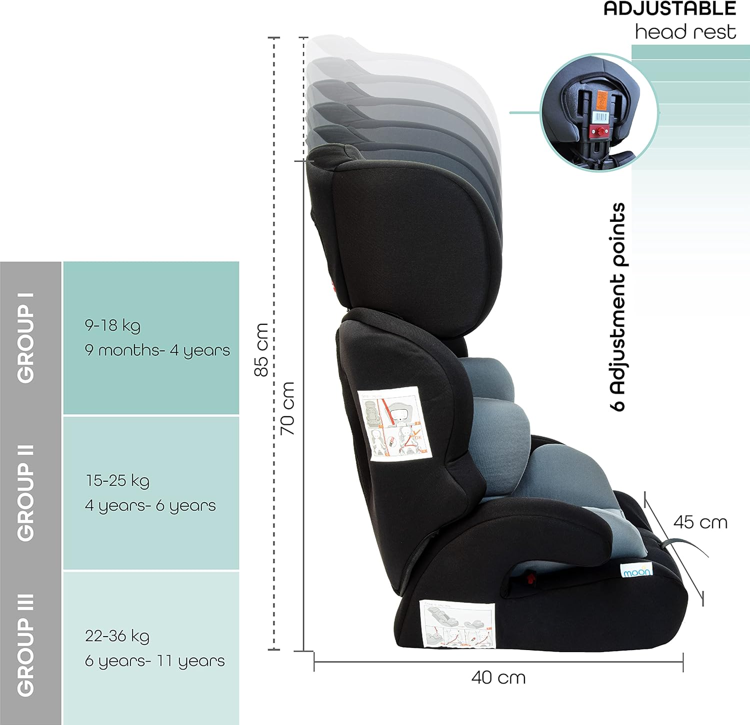- Finest-Quality Choice: The sturdy MOON car seat weighs only 5.5 kg, has EN Certification, and can safely support children weighing anywhere from 9 to 36 kg. A rainbow of eye-popping color combinations is available to always suit your child's unique taste