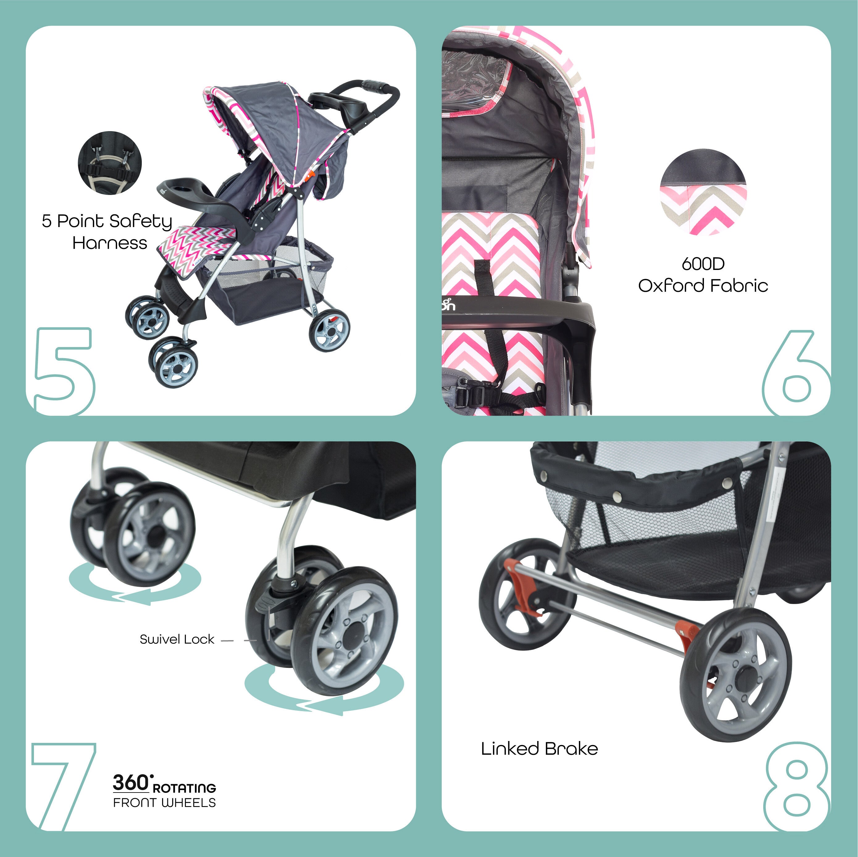 - Child-Friendly Design: Built to strict safety standards, the Trek one hand fold stroller enables you to take your infant with you everywhere. The stroller's swivel wheels have a fixer that allows for smooth wheeling, and the rear wheels include brakes for safe movement