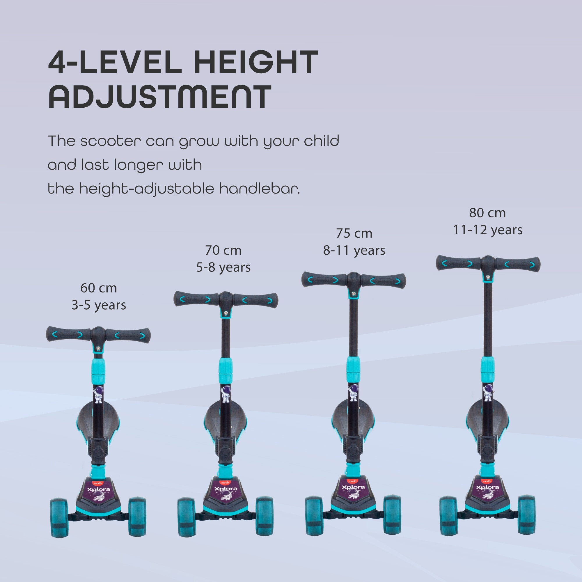- Durability - High quality materials have been used in the production of the scooter to allow it to hold upto 50 kgs. Maximum height is 127 cm, which means your child can use the Xplora for a long time.