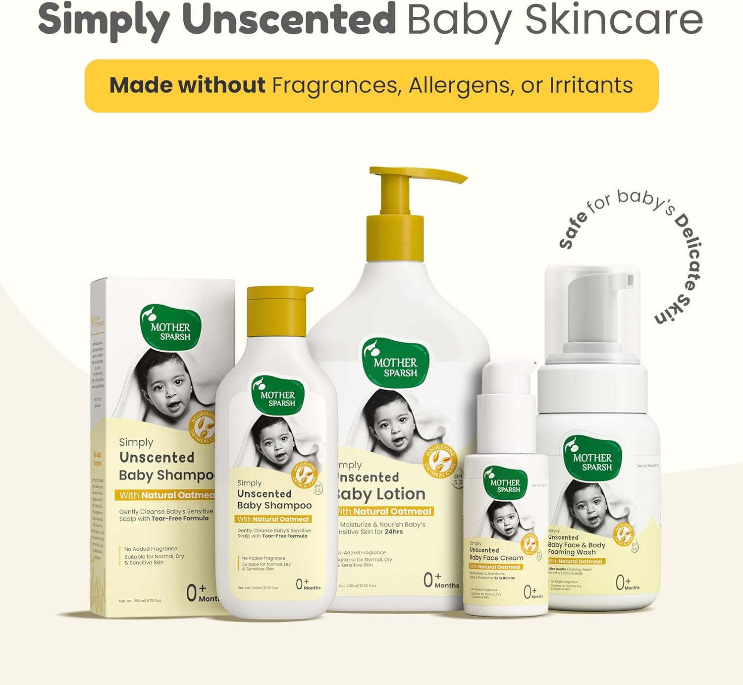 Meet Mother Sparsh Simply Unscented Baby Shampoo, made with Natural Oatmeal to care for baby’s developing hair & Scalp from Day 1. Its formula is balanced to a pH of 5.5 to protect your baby from 3 Signs Of Discomfort: Dryness, Itching, & Flaking of the delicate scalp & hair shaft. It is suitable for Normal, Dry & Sensitive skin! What makes it the best fragrance-free shampoo for babies? The soothing properties of natural oats help alleviate dryness, and irritation while gently cleansing Baby’s sensitive scalp with a Tear-Free Formula. Plus the soft lather of a balanced pH leaves your little one’s scalp & hair shaft clean gently!