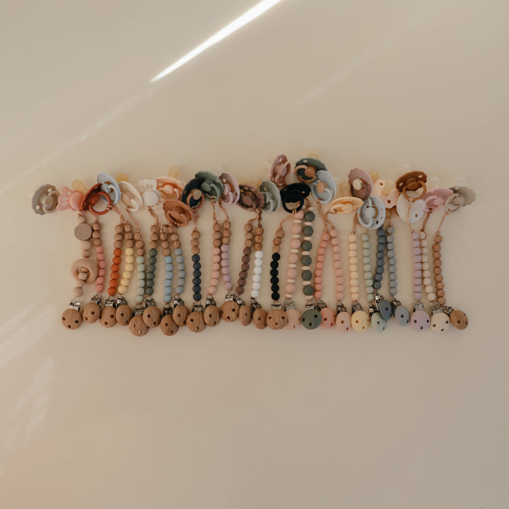 The Mushie silicone pacifier clip offers durability, function and simplicity to families on-the-go. Made from 100% food-grade silicone, our clip features a silicone clasp that brings a modern take to a traditional favorite. With two sizes of beads stacked in a simple pattern, the Luna clip is sure to become a favorite accessory for parents and littles alike. The clip is easy to clean and helps keep soothing items in reach for little ones.