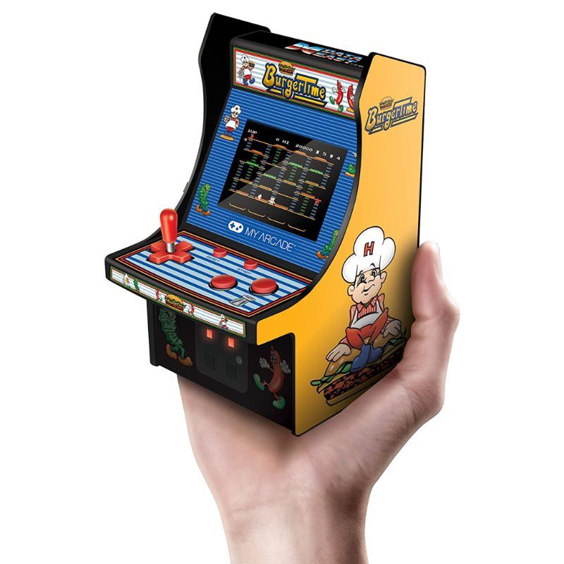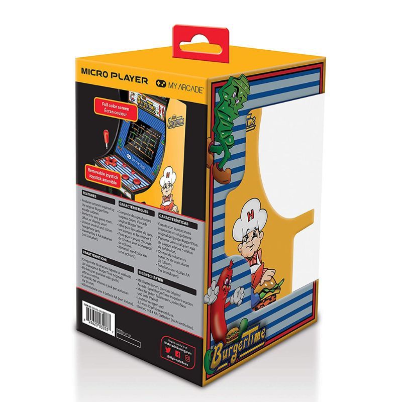 This My Arcade Micro Player features the classic game by DATA EAST, BURGERTIME. Armed with only a pepper shaker, Peter Pepper stepped into the arcade and into our hearts in 1982. Its highly addictive game play, unusual characters, and comedic storyline made BurgerTime an arcade classic. A game thats still challenging, exceedingly fun, and a shining reminder of the family friendly vibe and excitement that defined the early days of video games. My Arcade Micro Players are 6.75" mini retro arcade machines that are licensed and collectible. They feature original artwork on the cabinet along with a 2.75" full color back-lit display and removable joystick. Micro Players are awesome for fans of retro games who love to play, collect, or display classic games.