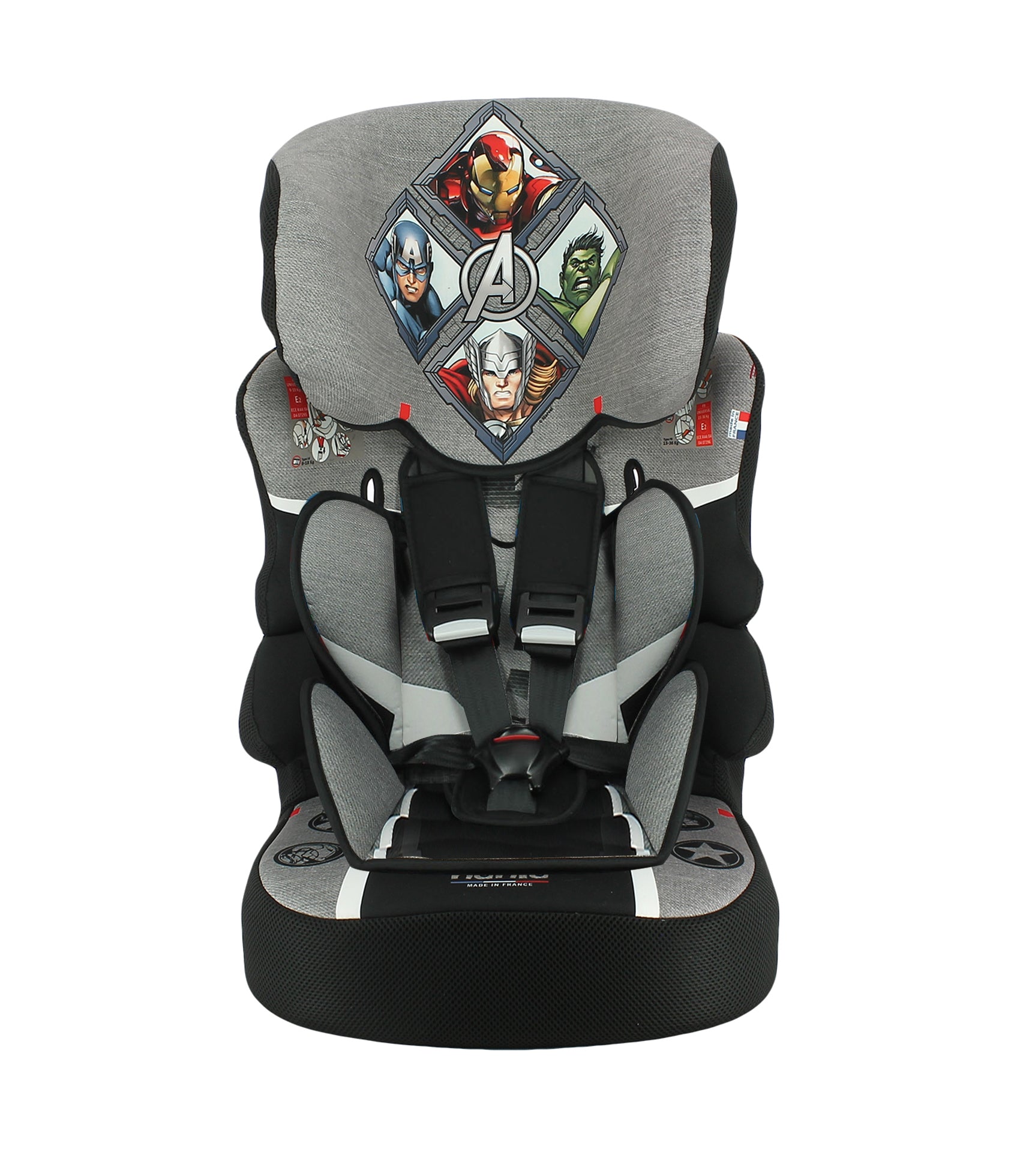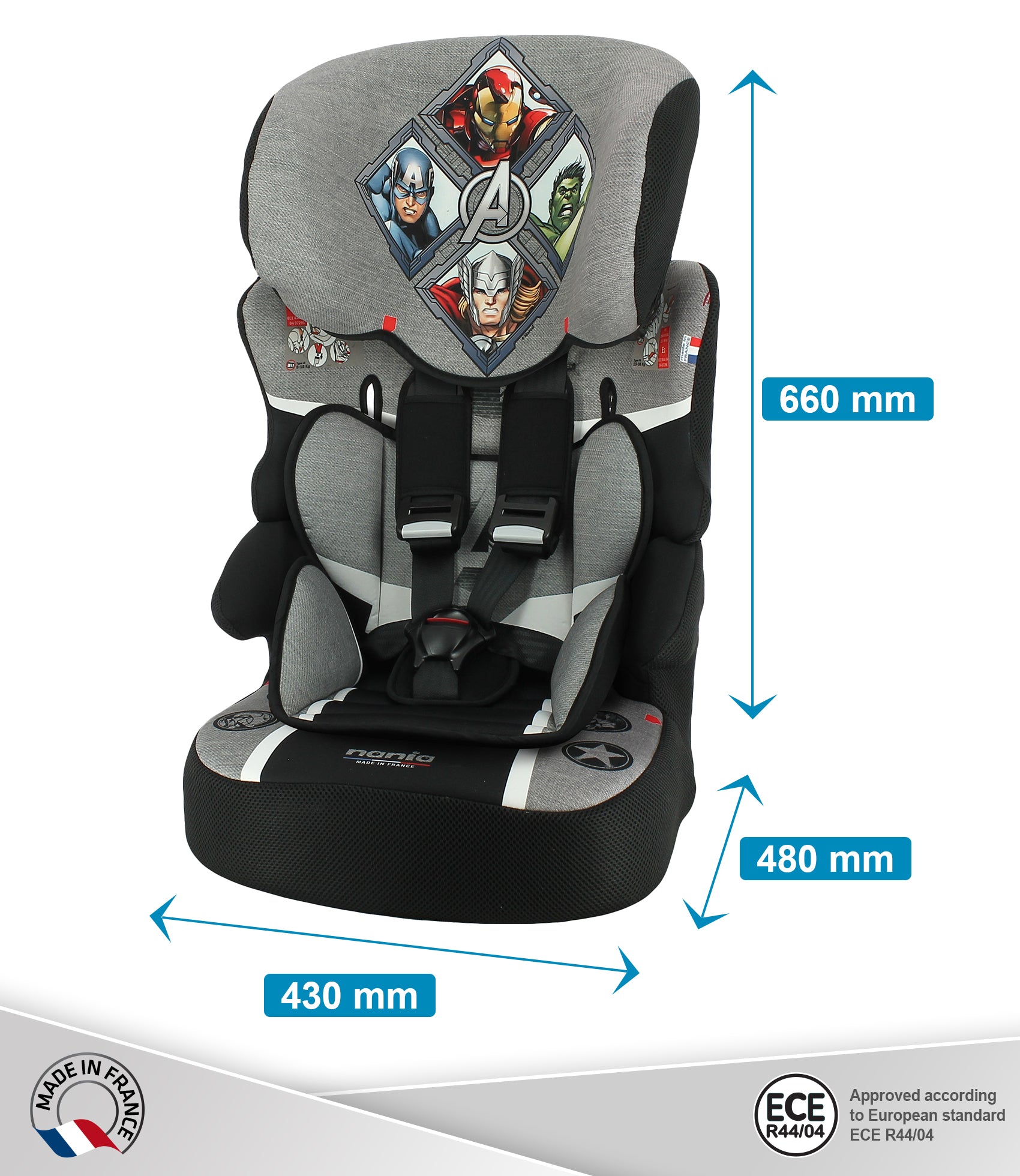 The BELINE car seat group 1/2/3 is suitable for children from 9 to 36kg (approximately 9months to 12 years old). It is approved according to the European standard ECE R44/04, manufactured and tested in France under very strict regulatory conditions. The car seat can only be installed forward facing position at the rear of the vehicle using the safety belt. It offers a great protection in the event of side impact and the child is perfectly supported with a 5-point harness with double adjustment shoulder strap that can be used from 9 to 18kg, then from 15kg, the child can be secured directly with the 3-point seat belt.