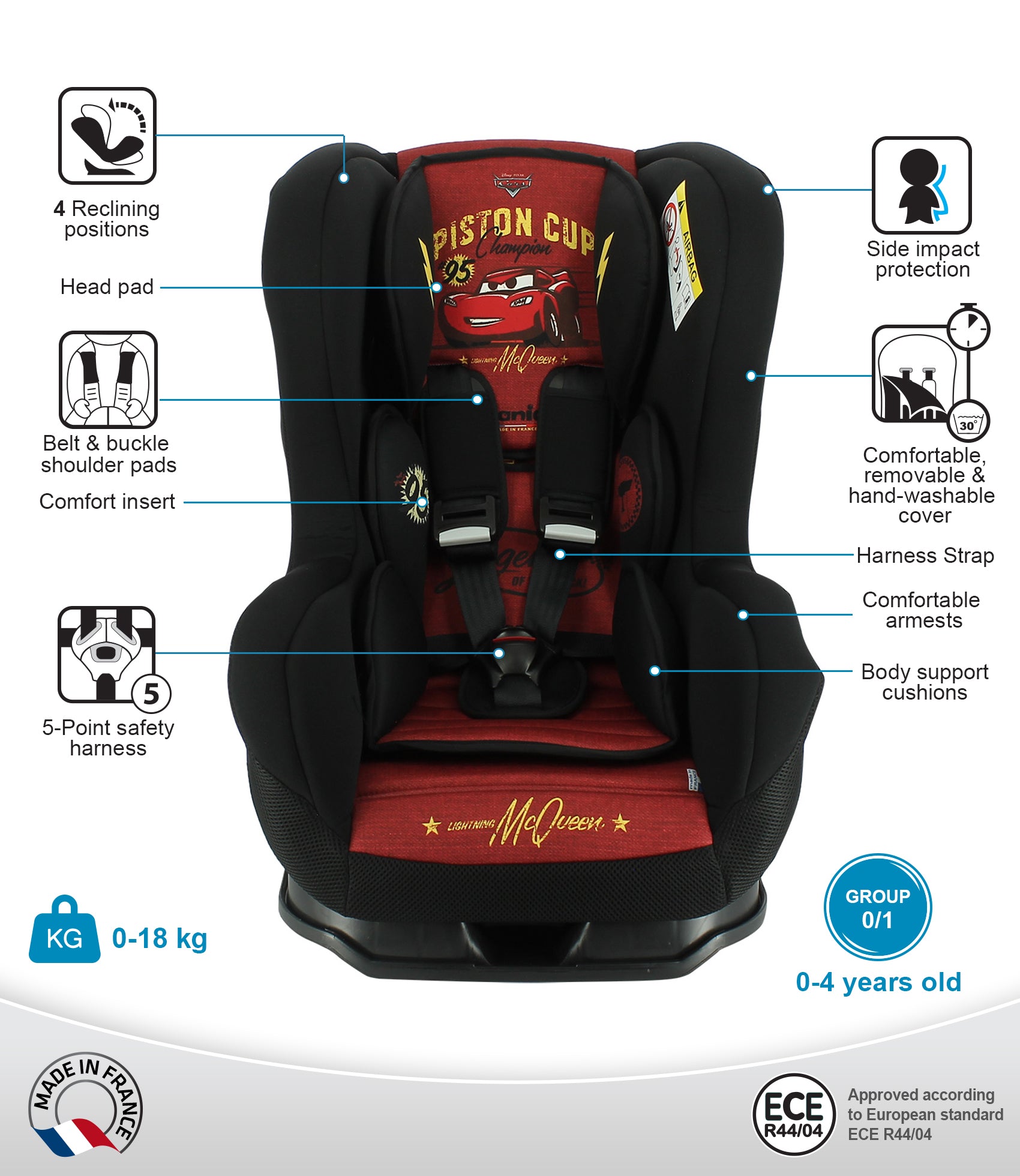 The COSMO car seat group 0/1 is for children from birth up to 18kg (approximately 0-4 years old). It is approved according to the European standard ECE R44/04, manufactured and tested in France under very strict regulatory conditions.