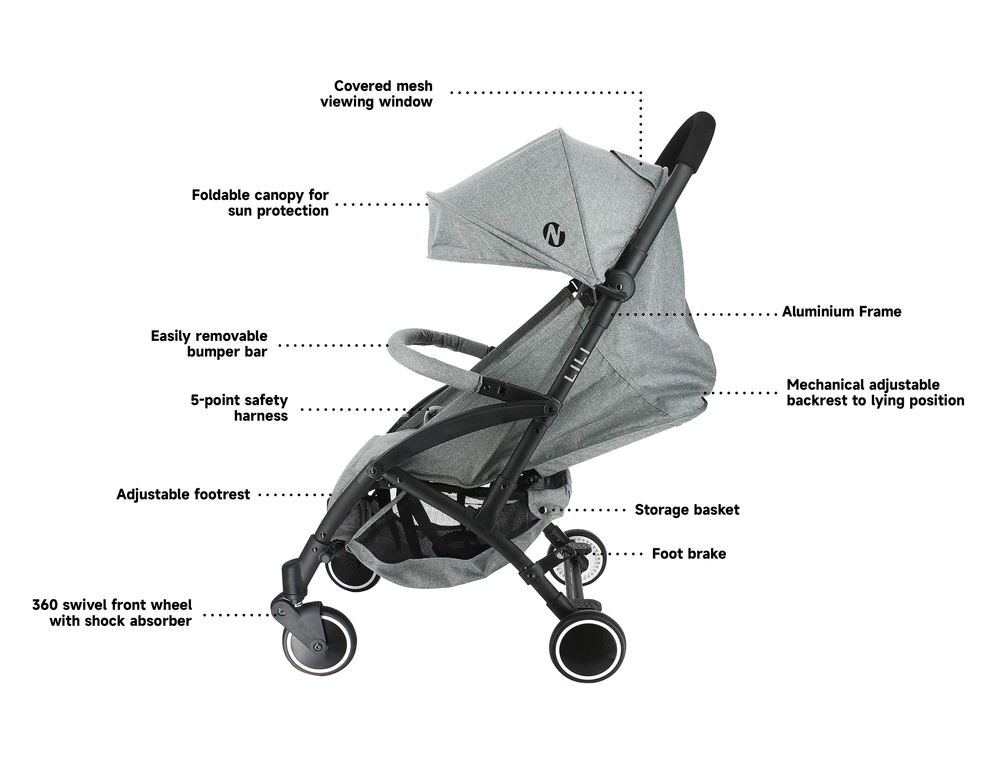 The LILI Compact Stroller combines functionality with style. Its modern grey fabric and sleek aluminum frame make it a chic accessory for parents on the go. Whether you’re running errands, strolling in the park, or navigating busy streets, this stroller ensures you do so in style and comfort.