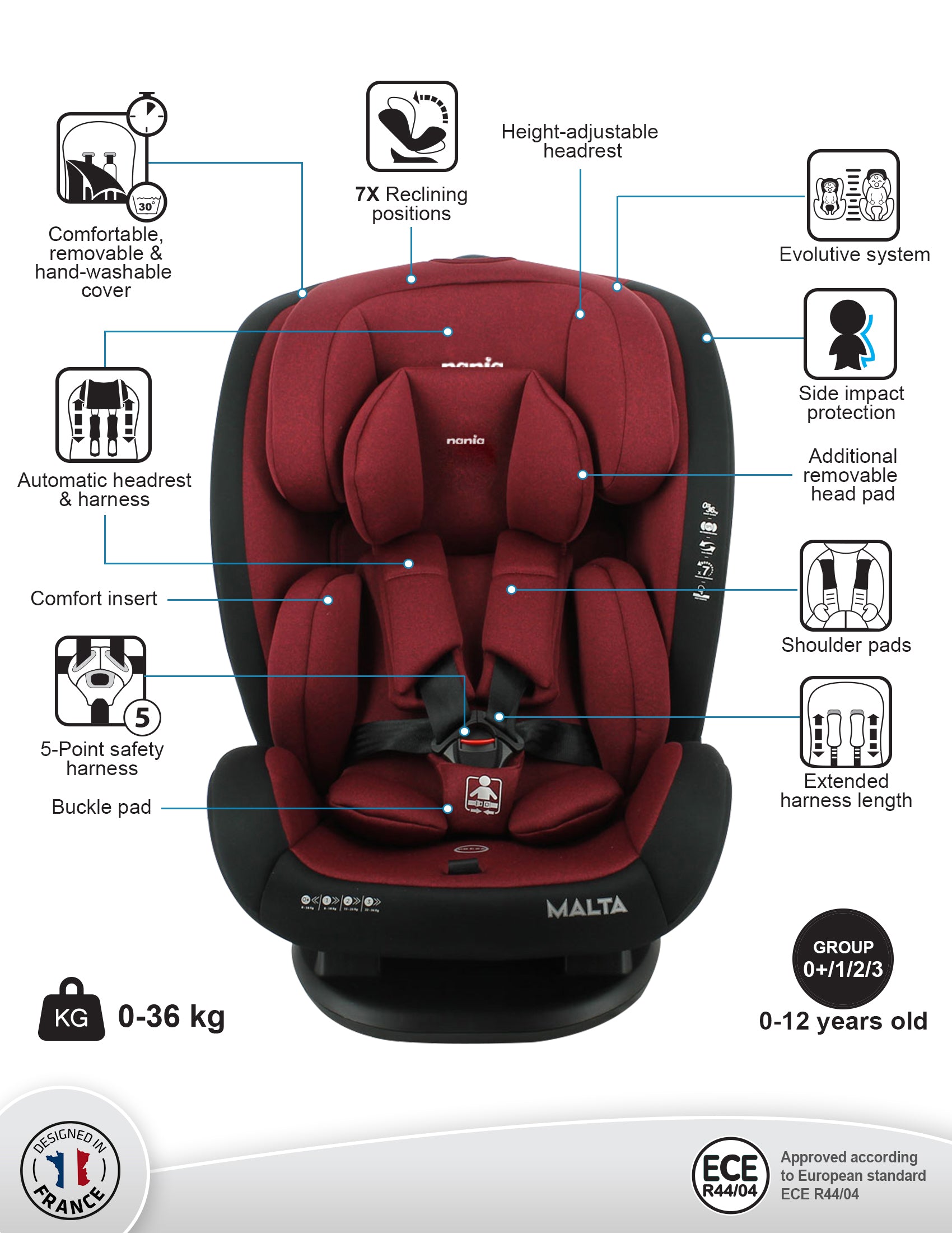 Generally, MALTA belongs to car seat group 0+/1/2/3, suitable from birth up to 36kg (approximately 12 years). It offers comfort and safety to your child, easy to install and use, that guarantees a pleasant car journeys.