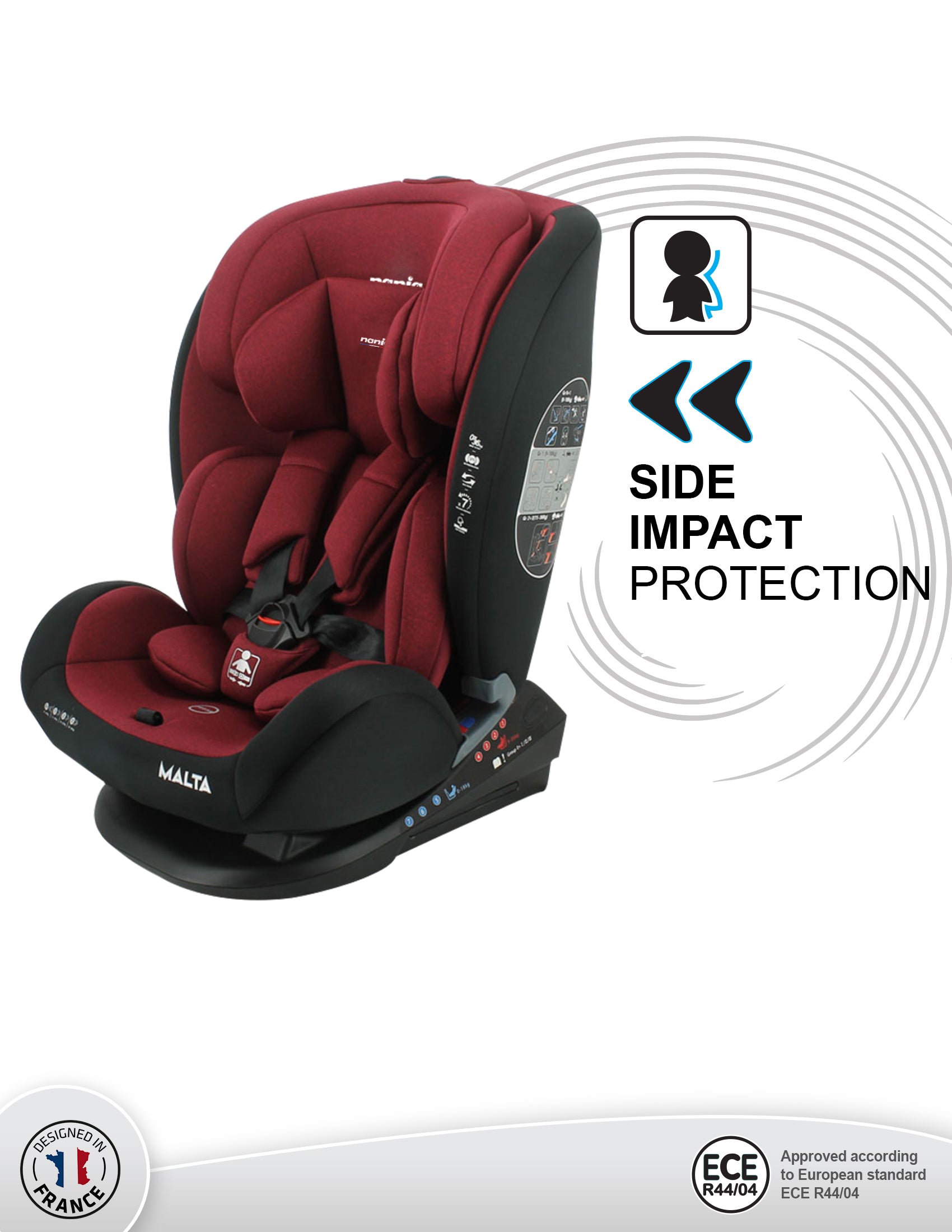 MALTA is an evolutionary car seat that will follow your child's growth from birth to 12 years of age to guarantee safety and comfort during car journeys. It is approved according to the European standard ECE R44/04 in group 0+/1/2/3 (0-36kg). The MALTA car seat is easily fixed using the car safety belt. It is designed with a solid and reinforced shell and is equipped with blue locking clips to lock the seat belt and facilitate installation. The child is held securely in the car seat with an adjustable 5-point harness that is equipped with comfortable padded strap guards and side impact protection. It offers a one-hand adjustability mechanism for the headrest wherein its harness will go along with the adjustment automatically ensuring a more comfortable and secure position.
