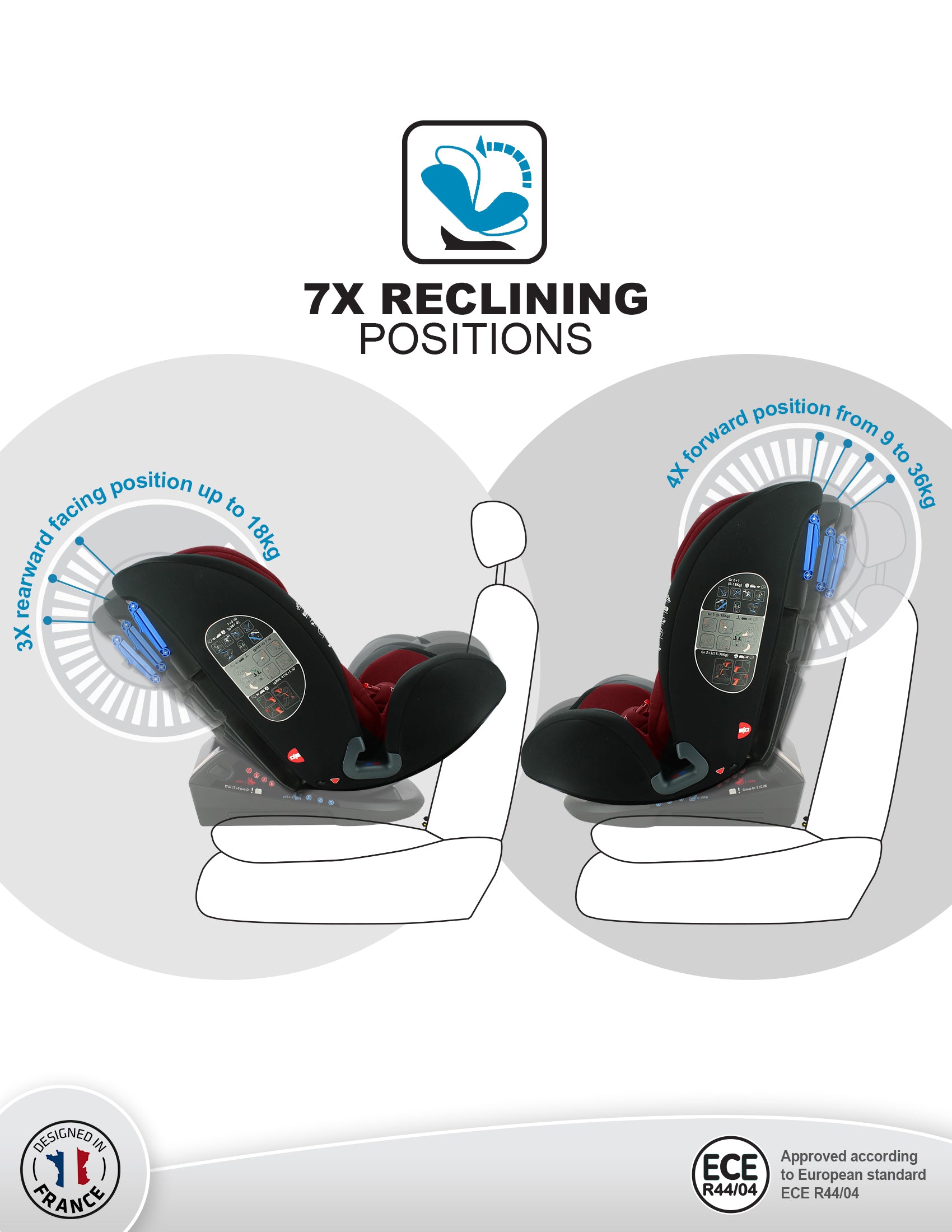 - EVOLUTIVE SYSTEM: Suitable for 0-18 kg in rearward facing and 9-36 kg forward facing position .