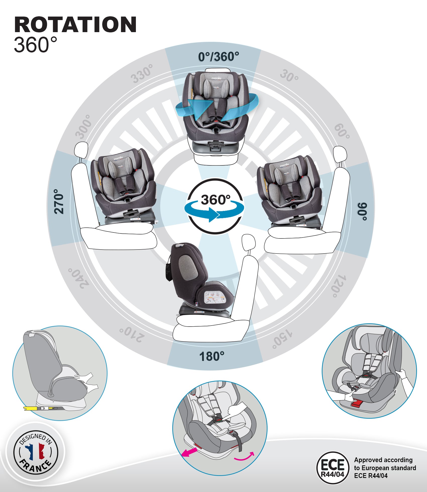 - 360° SWIVEL: To make it easier to place your child, the car seat swivels 360° on the rear, you just need to pull the lever at the front of the seat with one hand, turn the seat shell with the other hand.