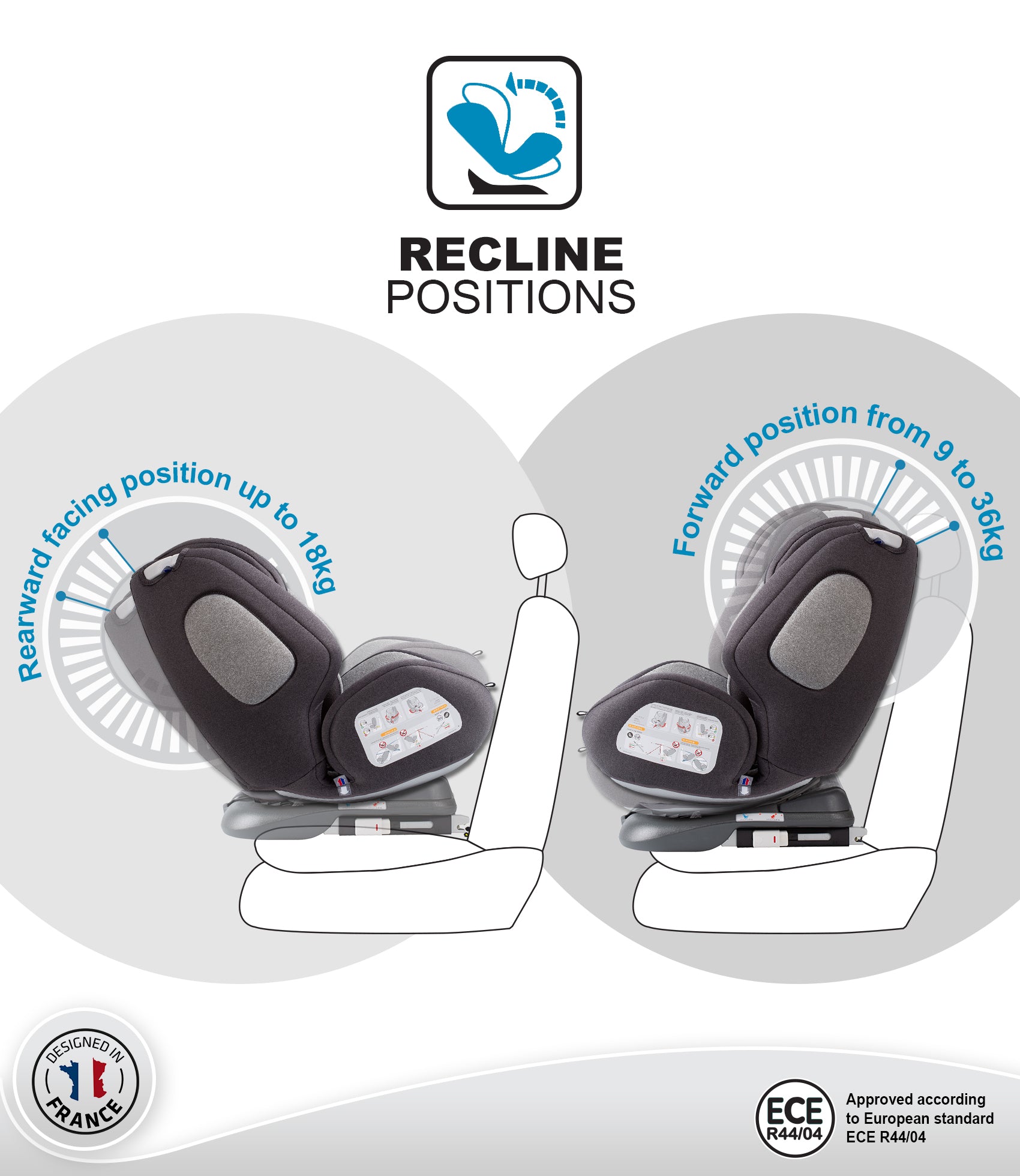 - COMFORT: The ONE 360° offers 3 recline positions (1 position for rearward facing and 2 positions for forward facing) so that your child is always comfortably seated during your journeys. Comfortable cover, padded shoulder straps with additional insert for pleasant car journeys that's easily removable and hand washable.