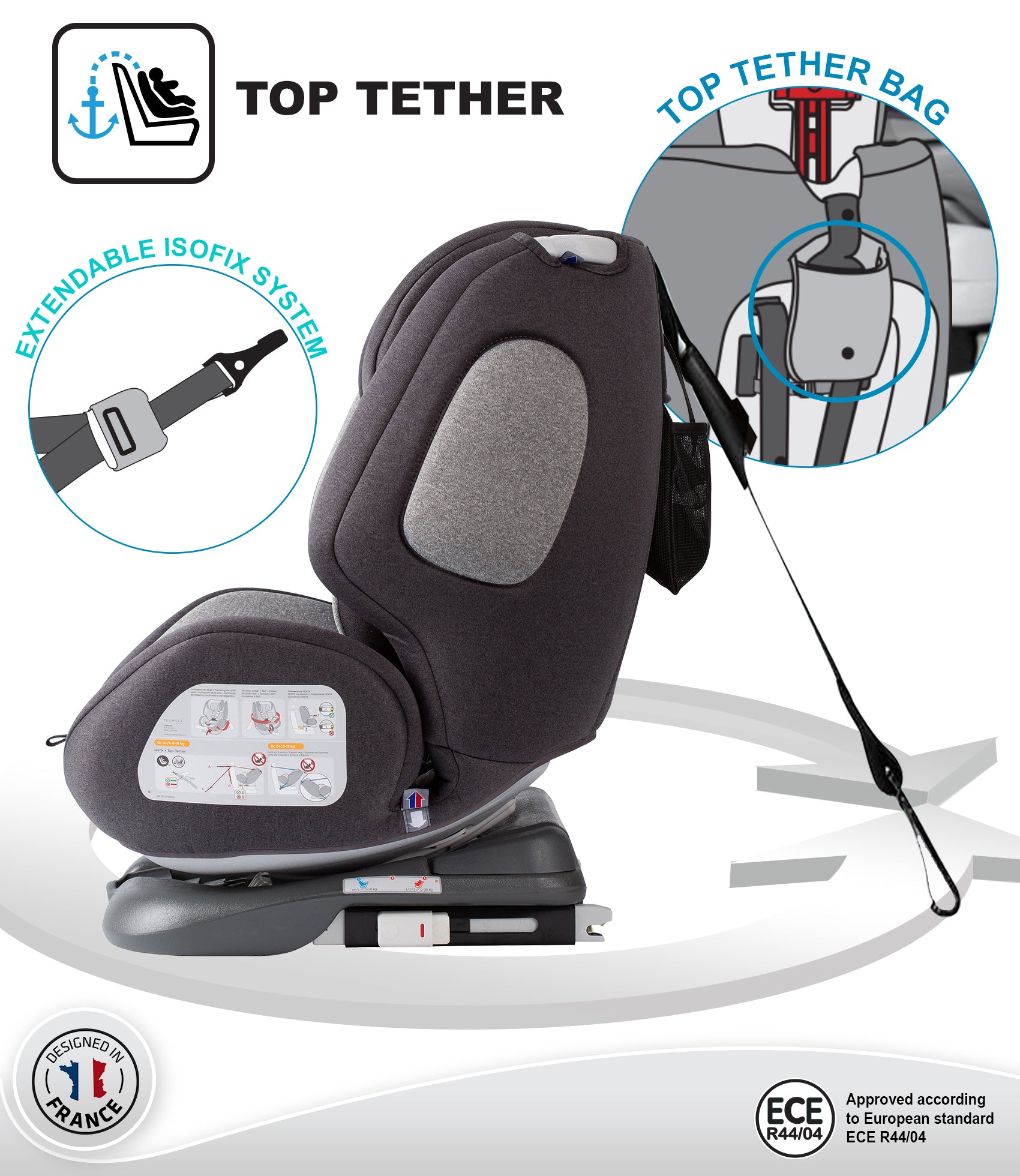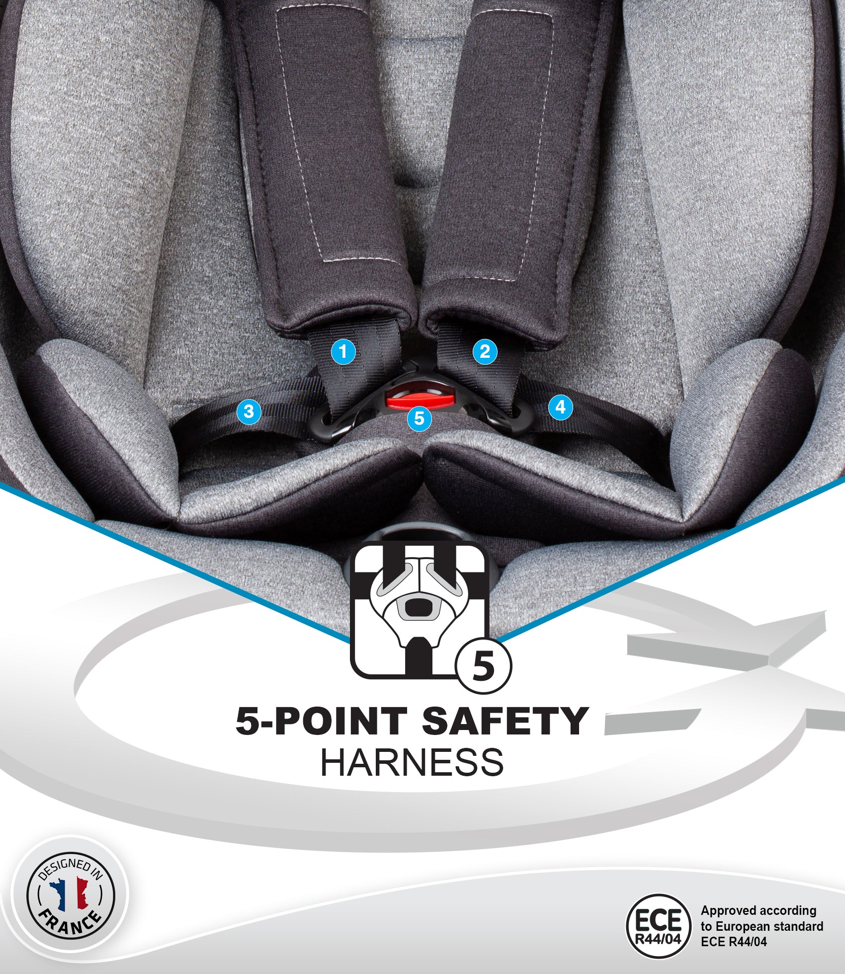 - HIGHEST LEVEL OF SAFETY: Tested & certified in France according to ECE R44/04 standard. This product is applicable for children in the ECE group 0+/1/2/3. Equipped with ISOFIX System. The car seat is fixed using the seat isofix bars which will clip onto the metal rings located under the bench. Availability of top tether for additional security.