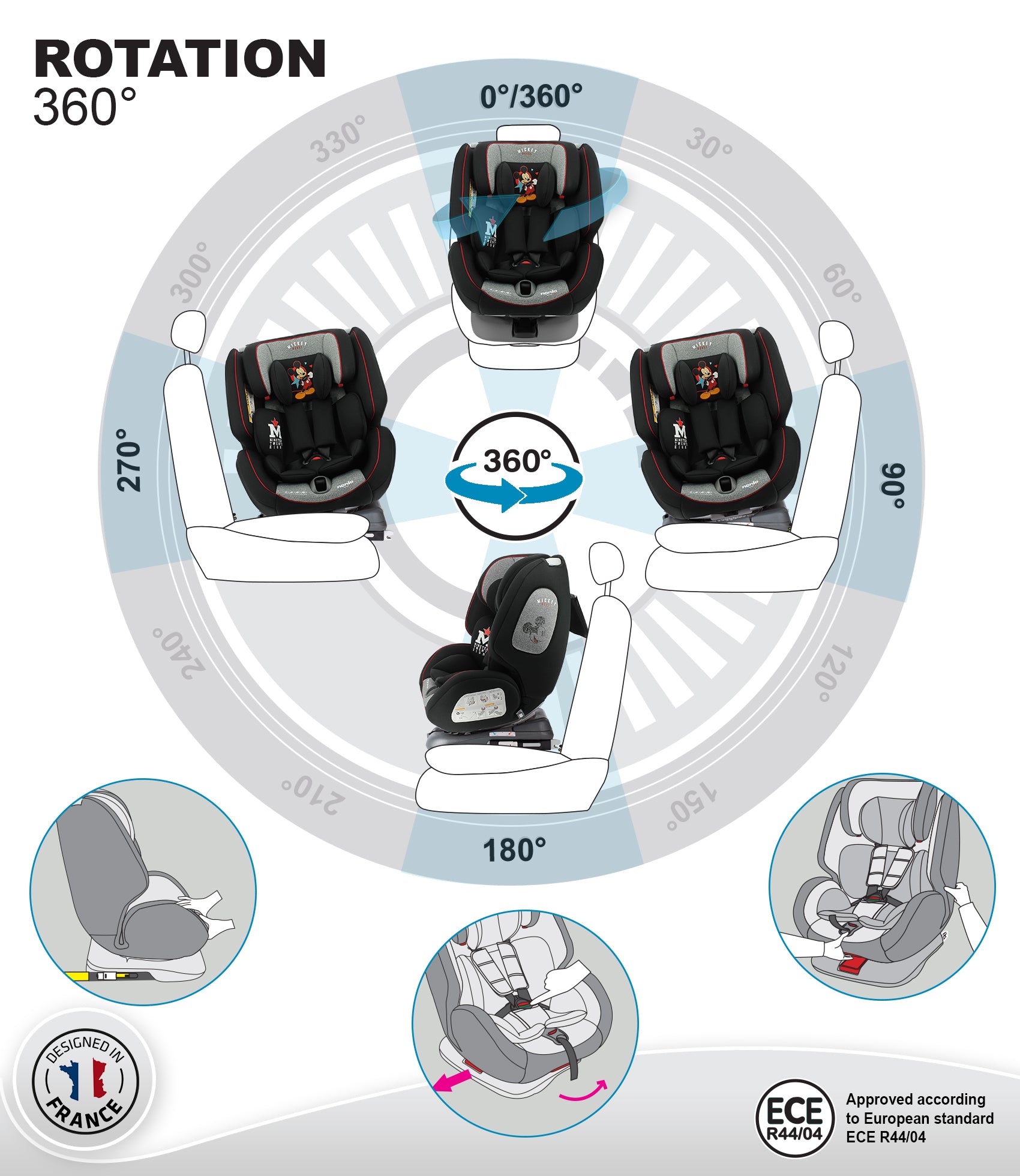 - 360° SWIVEL: To make it easier to place your child, the car seat swivels 360° on the rear, you just need to pull the lever at the front of the seat with one hand, turn the seat shell with the other hand.