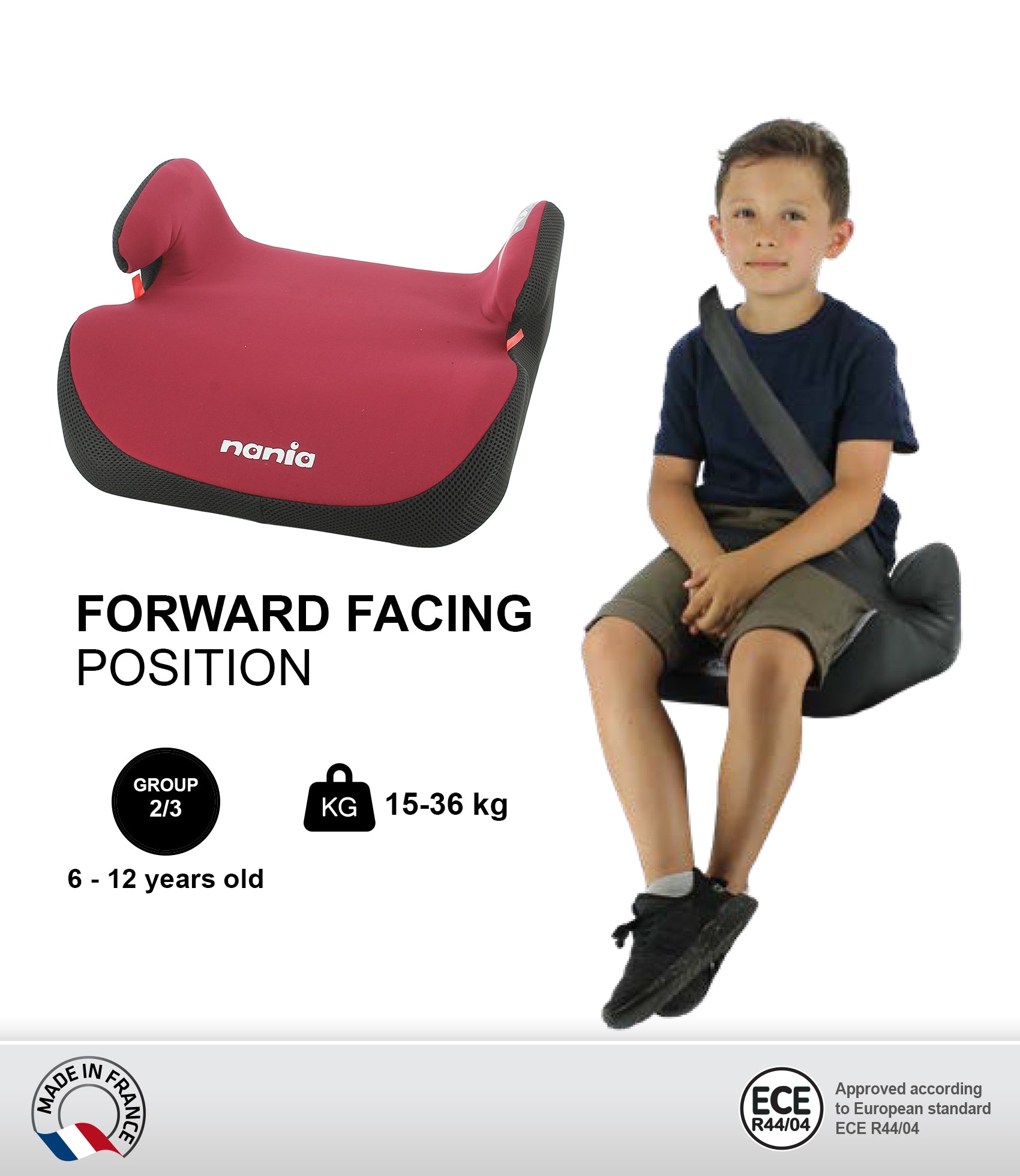 The child booster seat TOPO group 2/3 is suitable for children from 15 to 36kg (approximately 4 – 12 years old). It is approved according to the European standard ECE R44/04, manufactured and tested in France under very strict regulatory conditions.