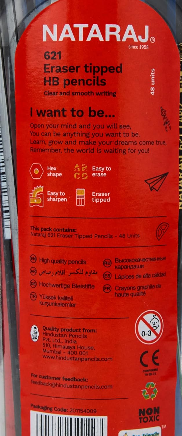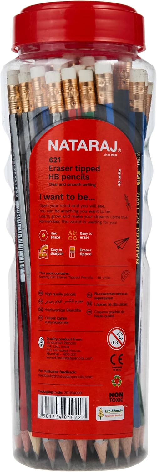 The Nataraj 621 HB Pencil is a reliable everyday writing tool with medium hardness (HB) graphite that offers smooth, clear lines. Its hexagonal body provides a firm, comfortable grip, reducing hand fatigue even after long use. This 48-piece set comes in assorted body colours, making it practical for classrooms, study groups, or workplace supplies. Each pencil is pre-sharpened and ready to use.