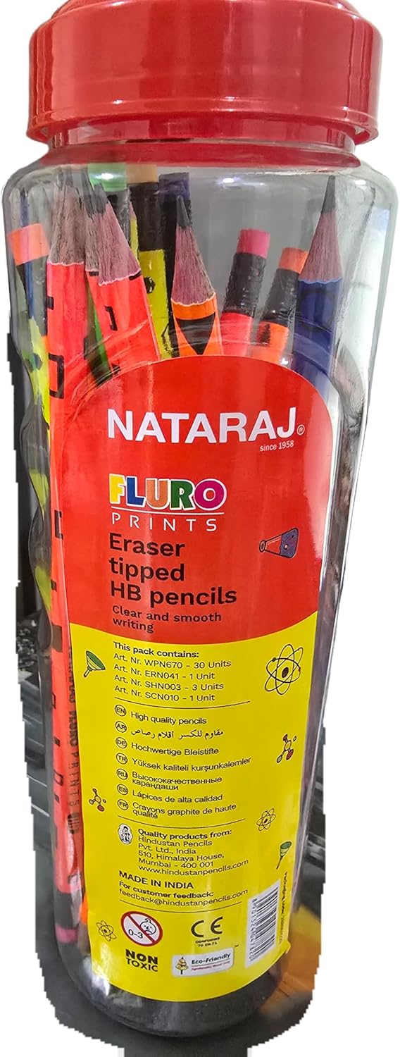 The Nataraj Fluro Print RT Pencil Combo Jar, feature vibrant fluro designs and smooth HB graphite that’s perfect for writing, sketching, or doodling. With a comfortable grip and neat erasing, they’re ideal for daily use. Packed in a sturdy combo jar for easy storage, it’s fun, functional, and ready for school or home.