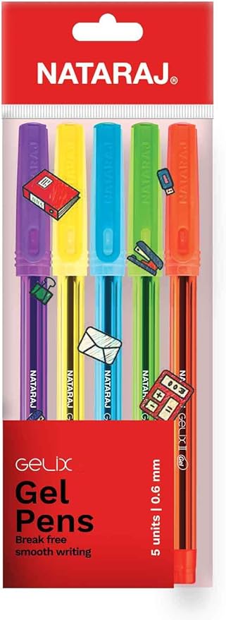 The Nataraj Gelix Gel Pen pouch in assorted colors is a versatile and fun writing set for students and creative individuals. This pack contains five pens, each with a different colored gel ink (typically a mix of blue, black, red, and green). The pens are designed to provide an exceptionally smooth and consistent writing experience, with the vibrant gel ink gliding effortlessly on paper. With its comfortable grip and variety of colors, this pouch is perfect for color-coding notes, creating colorful art, or simply adding a touch of fun to your writing.