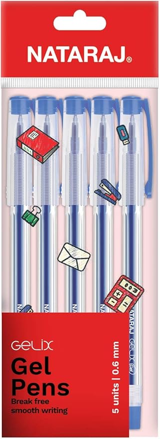 The Nataraj Gelix Gel Pen is a sleek and reliable writing tool that provides an exceptionally smooth writing experience. This pouch contains five pens with rich, vibrant blue ink, making it a perfect choice for students and professionals. The pen is designed to glide effortlessly on paper, ensuring a consistent and skip-free line. With its comfortable grip and modern design, the Nataraj Gelix is ideal for everyday writing, note-taking, and detailed work.