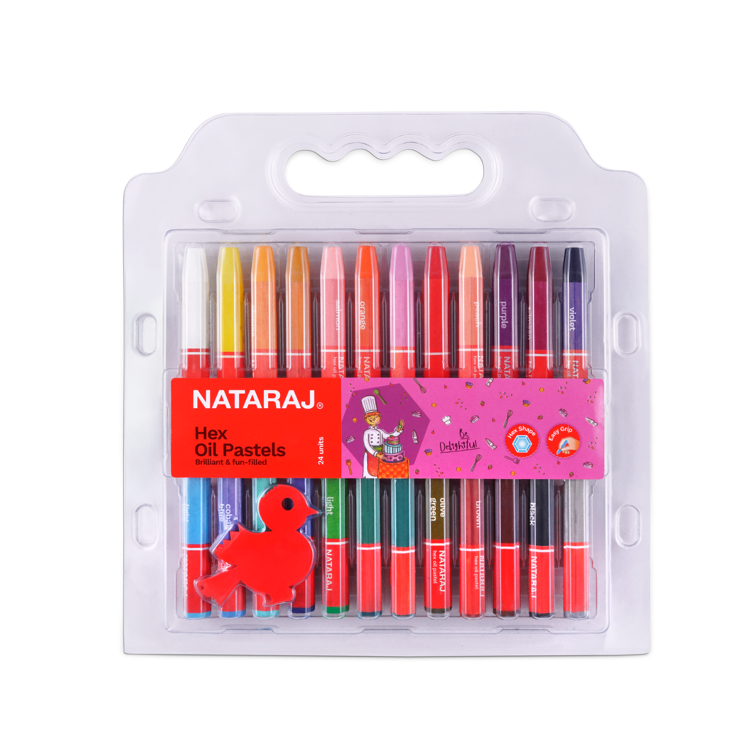 The Nataraj Jumbo Hex Oil Pastel set is a vibrant and versatile collection designed for both budding and experienced artists. This pack contains 24 richly pigmented oil pastels, each crafted with a jumbo, hexagonal shape that provides a comfortable and firm grip while preventing them from rolling off a desk. The pastels offer a smooth and creamy texture, ensuring a rich color laydown and excellent blending capabilities. The set also includes a scrapper tool, allowing artists to create unique textures and fine details in their work. All of this comes in a durable clamshell pack for easy storage and portability.