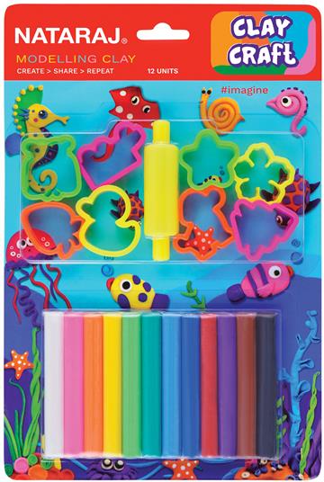 The Nataraj Modelling Clay set is a complete creative kit designed to inspire imagination and artistic skills in children. This pack includes 12 vibrant and rich colors of modelling clay, which is soft, pliable, and easy to mold. The clay is oil-based, meaning it will not dry out, allowing for endless hours of fun and reuse. The set also includes a plastic roller for flattening the clay and 8 "toys," which are various plastic molds or shapers to help children create different shapes and figures. All components are neatly organized in a durable blister pack, making it a perfect gift or activity set.