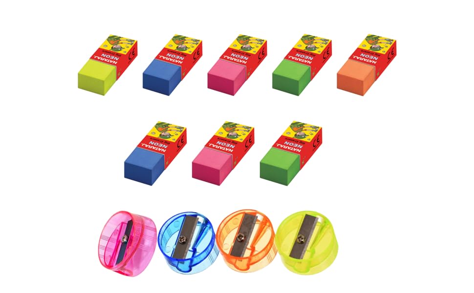 - Set includes 8 neon big erasers and 6 round sharpeners, perfect for school or office
