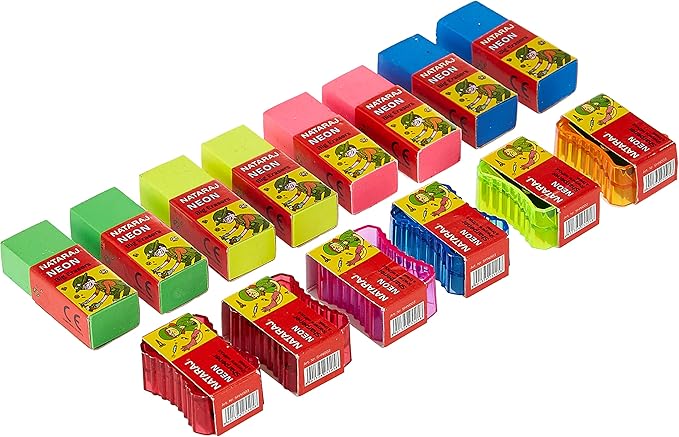 Nataraj Neon Big Set includes 8 x eraser and 6 x sharpner which are made from high quality materials. This sharpners are scientifically angled blade for easy sharpening. It has anti-rust coating for longer lasting blade edge. This eraser removes tough marks, leaves no dust behind. Completely erases graphite without damaging the paper.