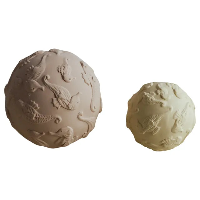 Playful and fun bath time for little hands! Let your little one explore, play and develope senses with this playful Natruba bath set. The set comes on a set of two different sized balls with a bell in each for playfully stimulating the sense of hearing. The little sized ball is easy to grip for even the tiniest hands. The soft natural rubber and the playful ocean inspired pattern and the balls encourage sensory play and develop senses in a conforting , stylish, and playful way.