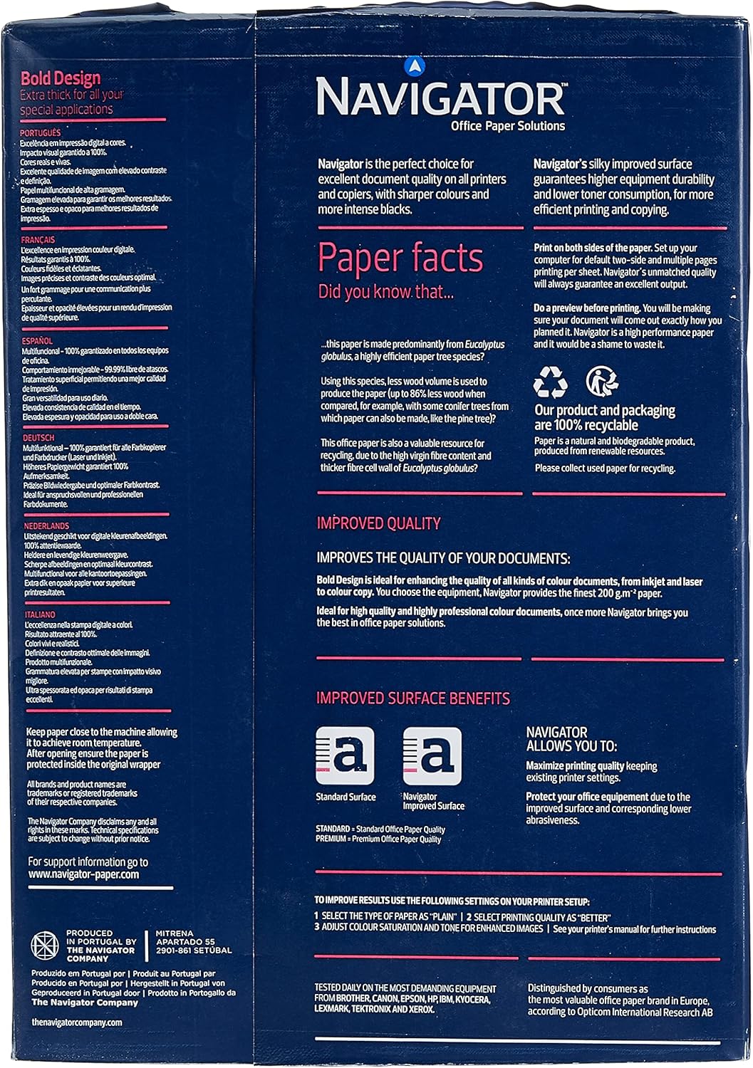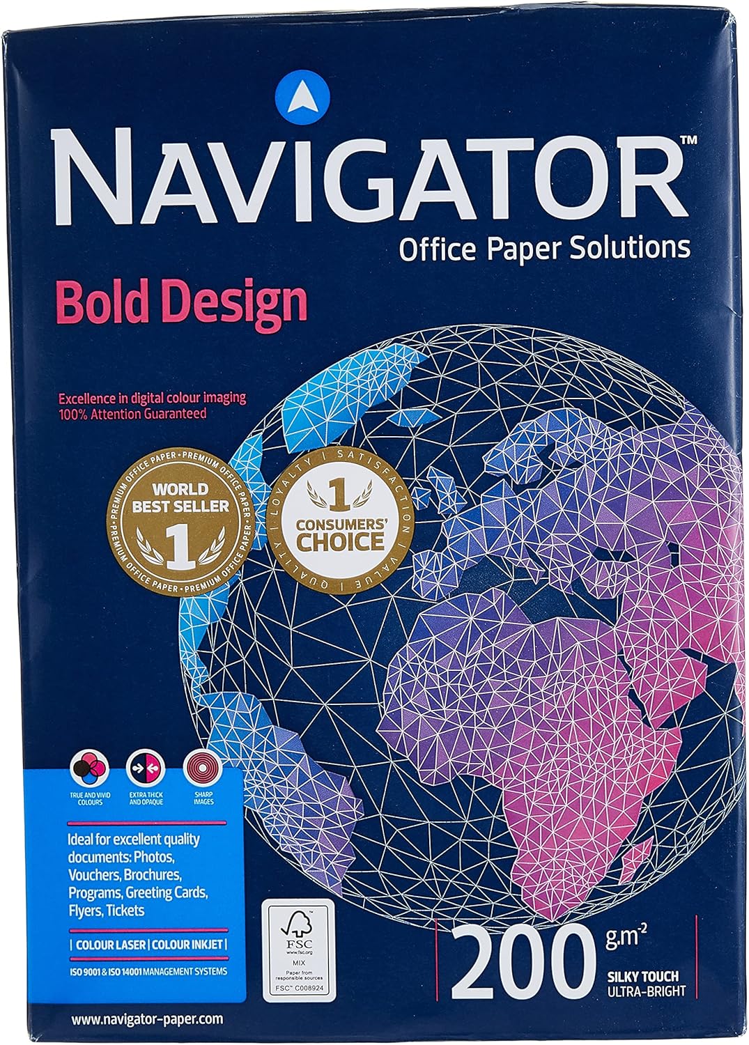 Navigator A4 200 GSM Photocopy Paper, also known as "Bold Design," is a very thick and stiff paper designed for high-end digital color printing. The 200 GSM weight provides a substantial and luxurious feel, making it perfect for documents that need to stand out. Its ultra-smooth surface and high whiteness ensure that colors appear vivid and strong, with excellent contrast and definition. This paper is a great choice for creating high-resolution prints like photos, brochures, and other specialty documents. It is compatible with all office equipment, including laser, inkjet, and copiers.