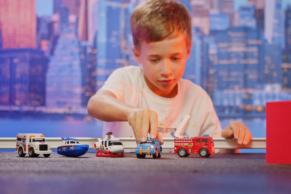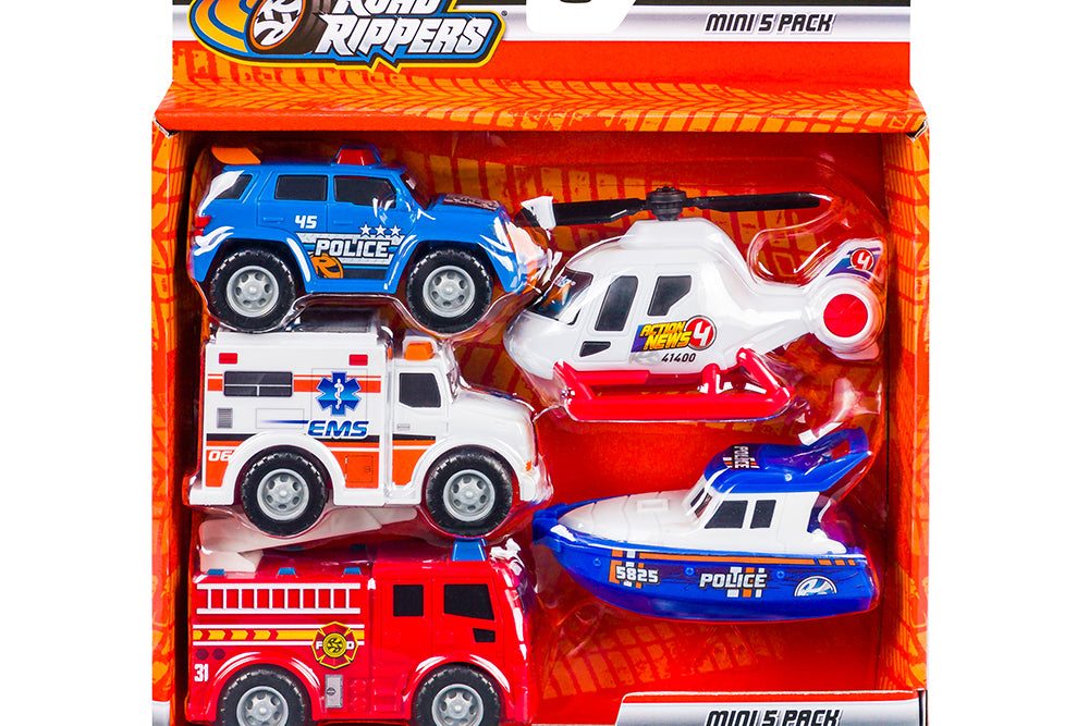 Teamwork, it gets the job done! These hand articulated hardworking vehicles are tough enough for any job. Save the city with the Rush and Rescue set. Each box comes with a full complement of 5 free wheeling vehicles.