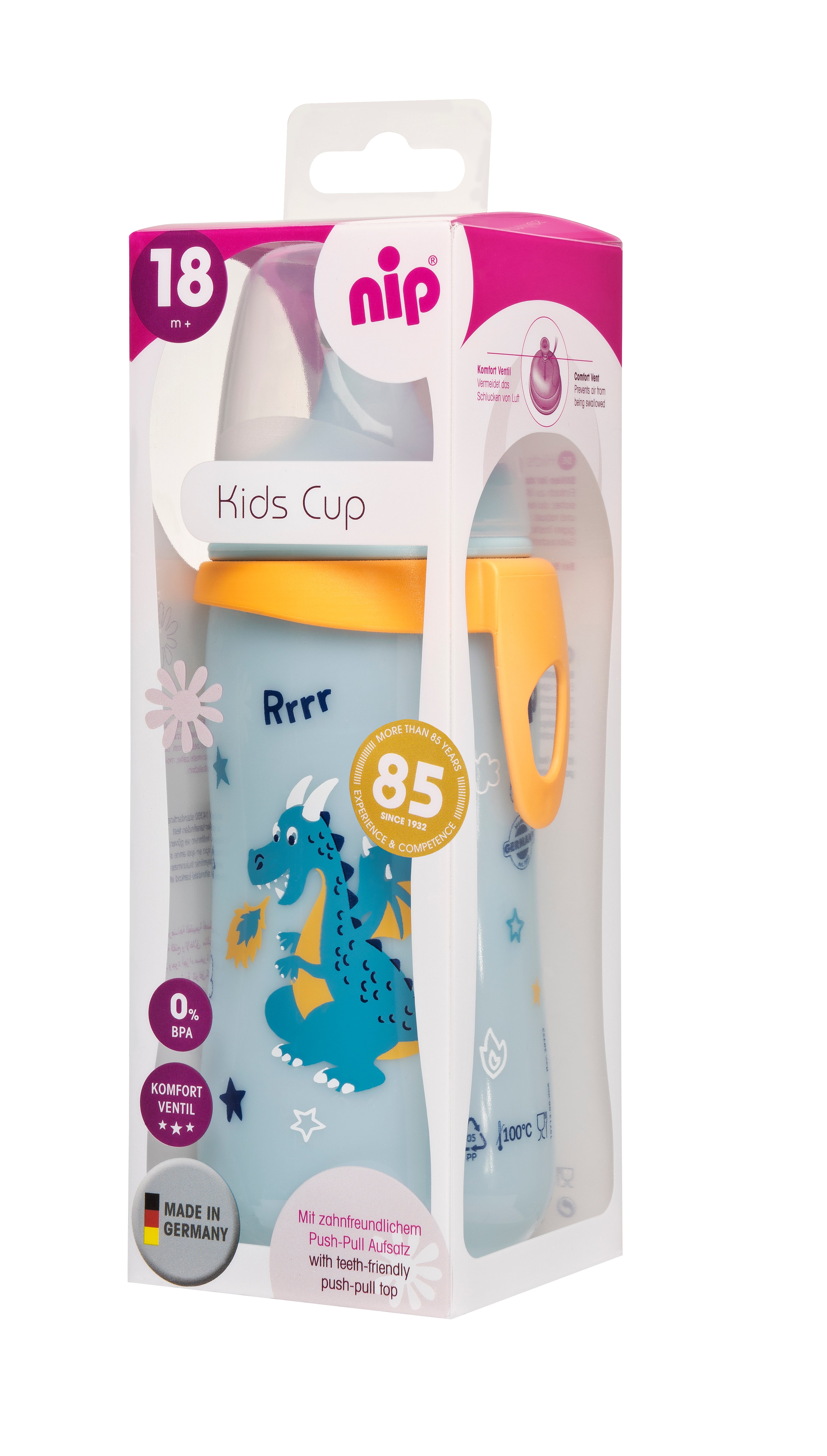 Produced in Germany with the highest quality standards, the Nip Kids Cup combines durability, safety, and ease of use. Whether you're at home or out and about, this self-sterilizing, anti-colic baby bottle supports your childƒ??s development while making your life easier.