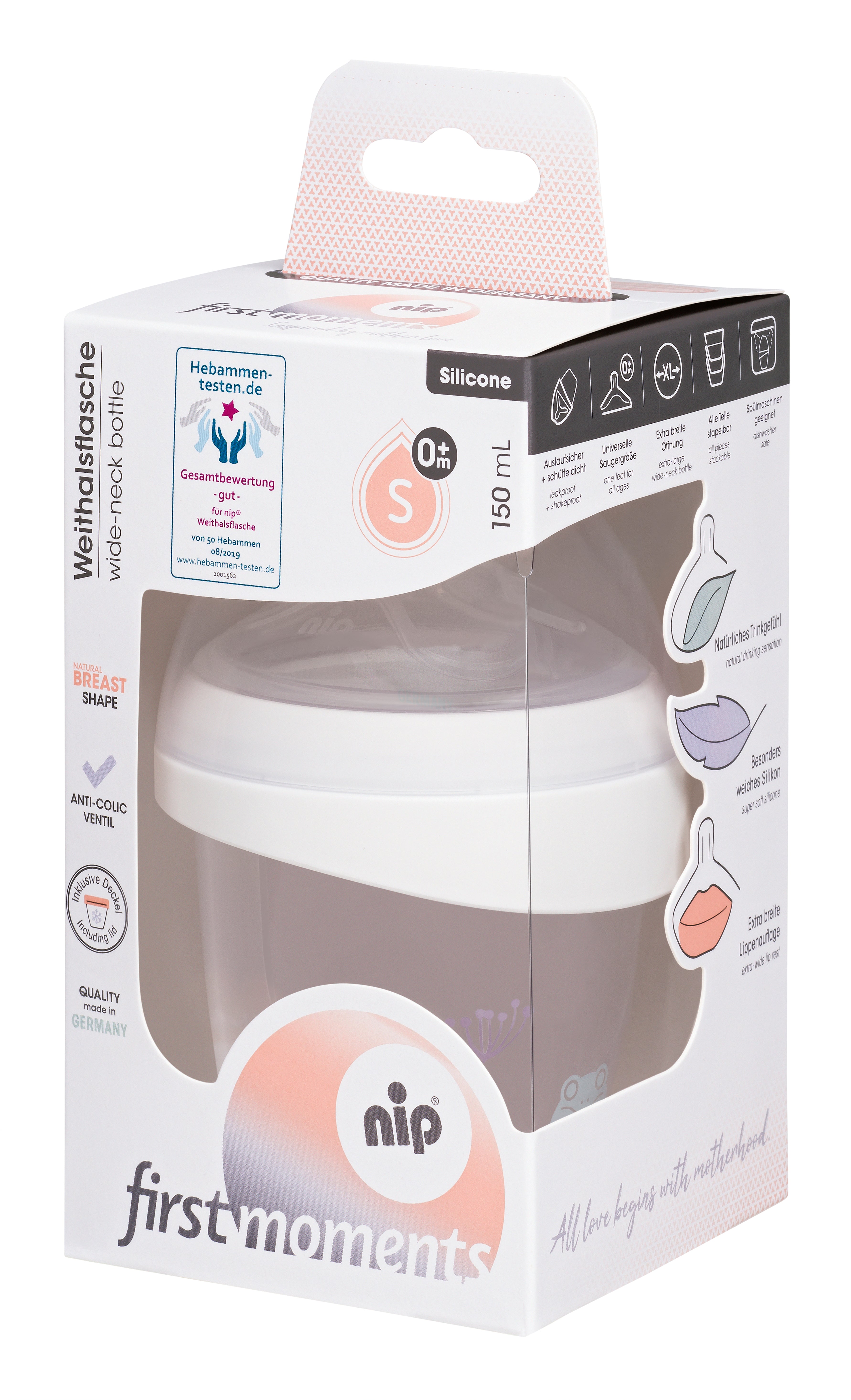 The dream team for a perfect start: our first moments wide-neck bottle with matching silicone teat. The round shape of the teat and the extra-wide lip rest copy motherƒ??s breast and create a natural drinking sensation. Made of particularly soft silicone, our teat stands for an incomparably gentle drinking experience. The proven anti-colic vent and the ACTIFLEX- system both ensure a smooth, steady drinking flow.