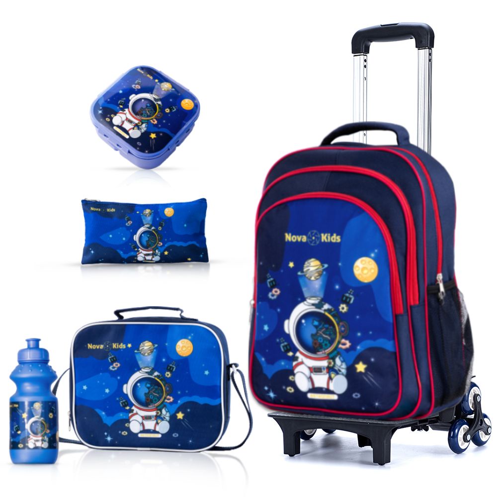 We strive to bring smiles to moms' faces by offering practical solutions like the Nova Kids School Bag Set and the innovative School Bag Trolley, ensuring both style and functionality for hassle-free school days. PACKING INCLUDES: 1x School Bag, 1xLunch Bag, 1xPencil Pouch, 1xLunch Box, 1xWater Bottle, 1xKids Trolley.