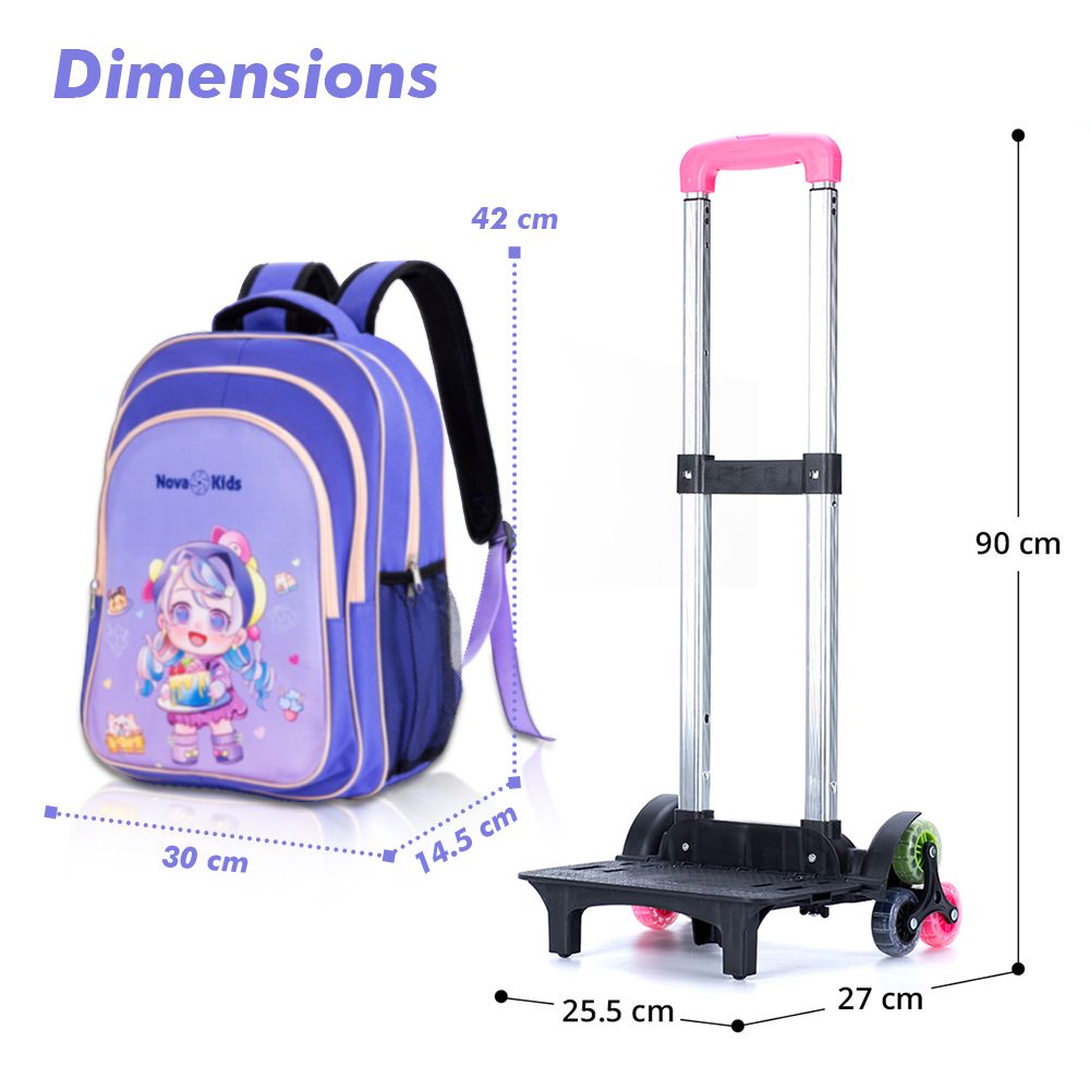 We strive to bring smiles to moms' faces by offering practical solutions like the Nova Kids School Bag Set and the innovative School Bag Trolley, ensuring both style and functionality for hassle-free school days. PACKING INCLUDES: 1x School Bag, 1xLunch Bag, 1xPencil Pouch, 1xLunch Box, 1xWater Bottle, 1xKids Trolley.