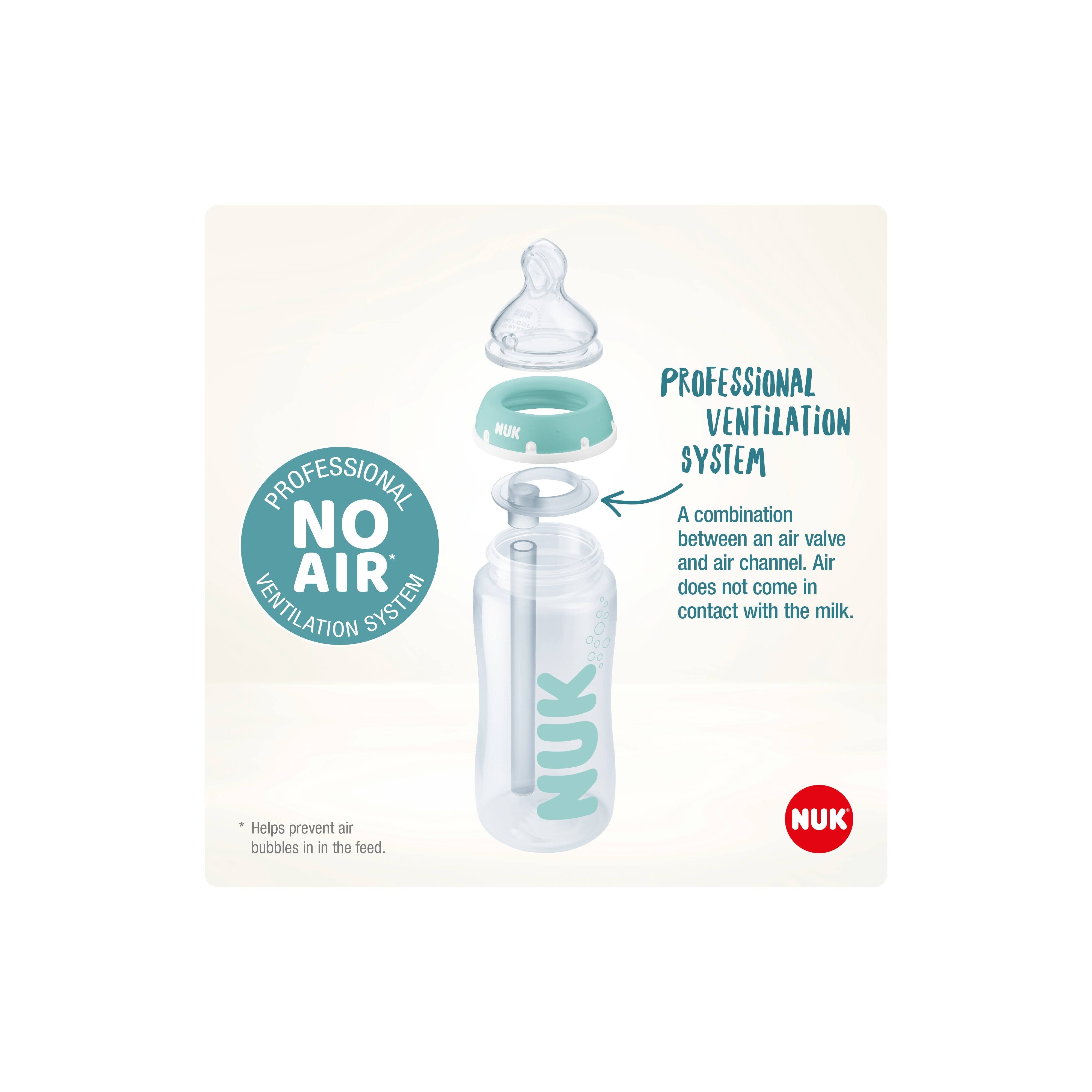 - Developed to help prevent colic*, the Nuk Professional Ventilation System combines an air valve in the teat to prevent collapsing and a tube in the bottle that separates the air and food