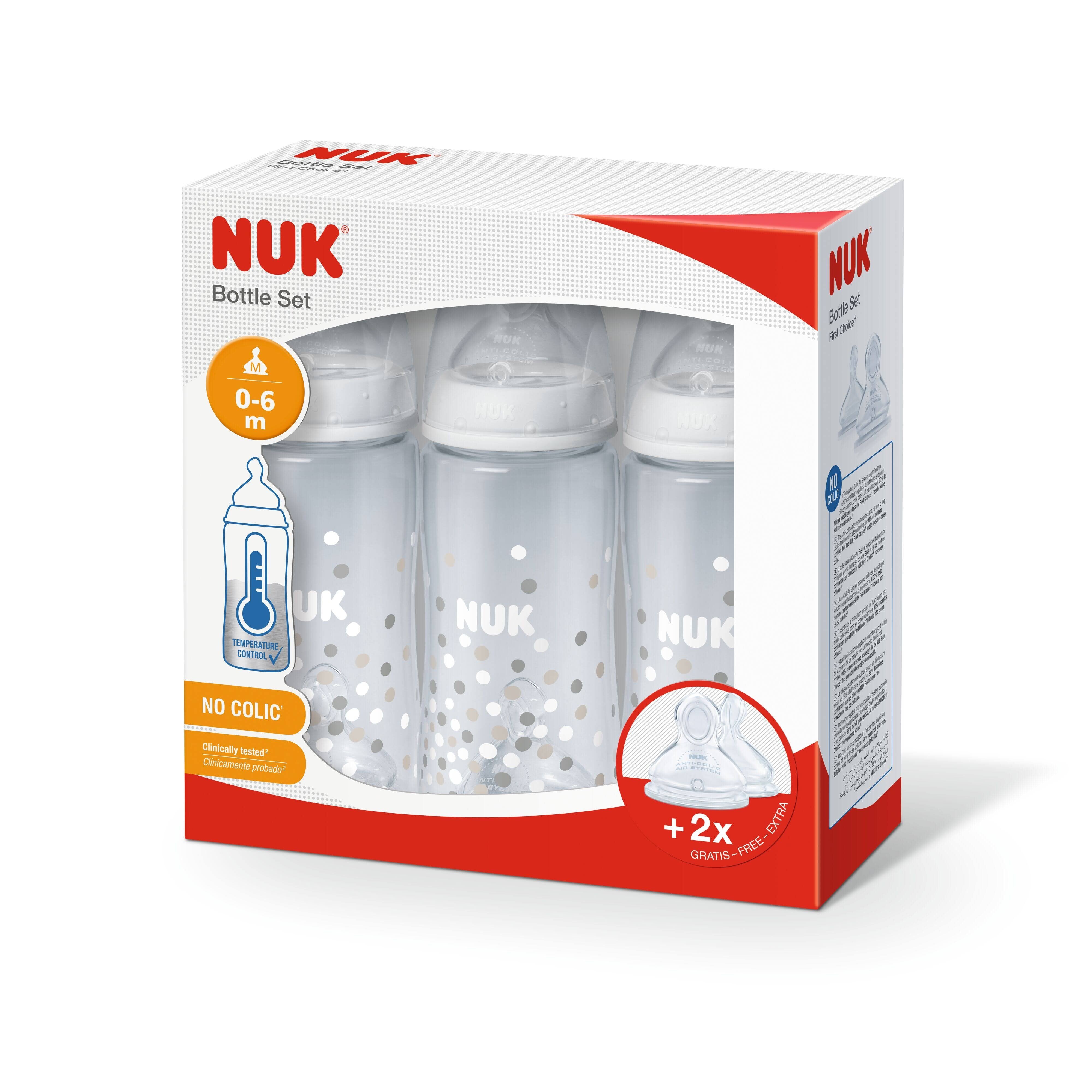 Nuk First Choice+ 3 plus 2 Set with temperature control, value set with Nuk First Choice+ PP baby bottles with two extra teats, BPA free, age 0-6 months