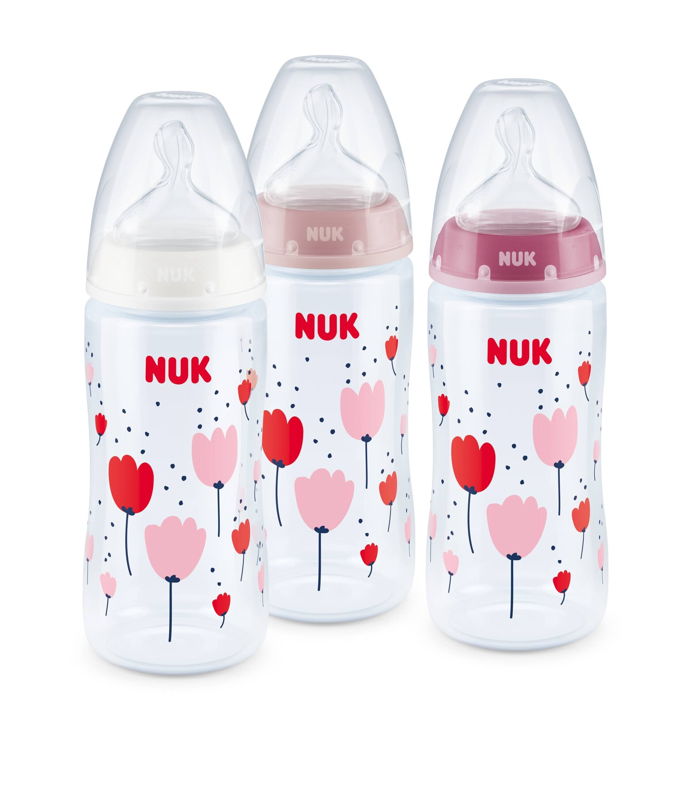 Nuk First Choice+ anti-colic wide neck baby bottles are unbreakable and feature a maximum capacity of 300 ml. The extra-wide neck of the bottles makes it particularly easy for you to fill and clean them. Due to the slightly waist-like shape the Nuk First Choice+ baby bottles fit comfortably in your hand. The wide bottom of the bottle provides a high stability. All three baby bottles of Nukƒ??s First Choice+ 3 plus 2 comes with silicone teats. The Nuk First Choice+ teats are naturally shaped and orthodontic. If you wish to combine breastfeeding with bottle-feeding, then the Nuk First Choice+ baby bottles are the right choice for you.