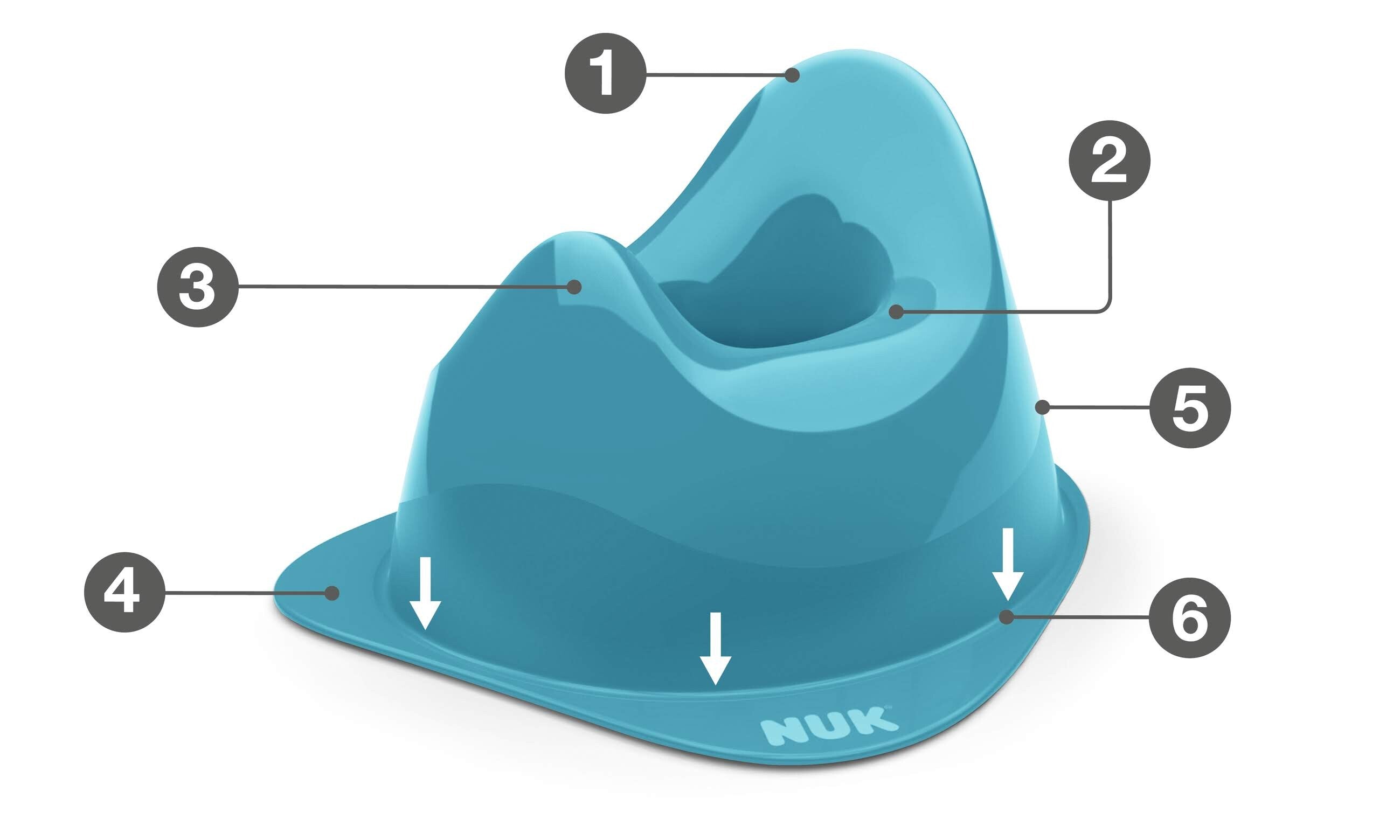 The Nuk Potty is ergonomically-shaped and has both a high backrest and a high splash guard and, with a collecting groove on the outer rim, it is particularly hygienic. An extra-large seat gives maximum comfort when sitting and its practical open hand grip means the potty can also be hung up to save space.