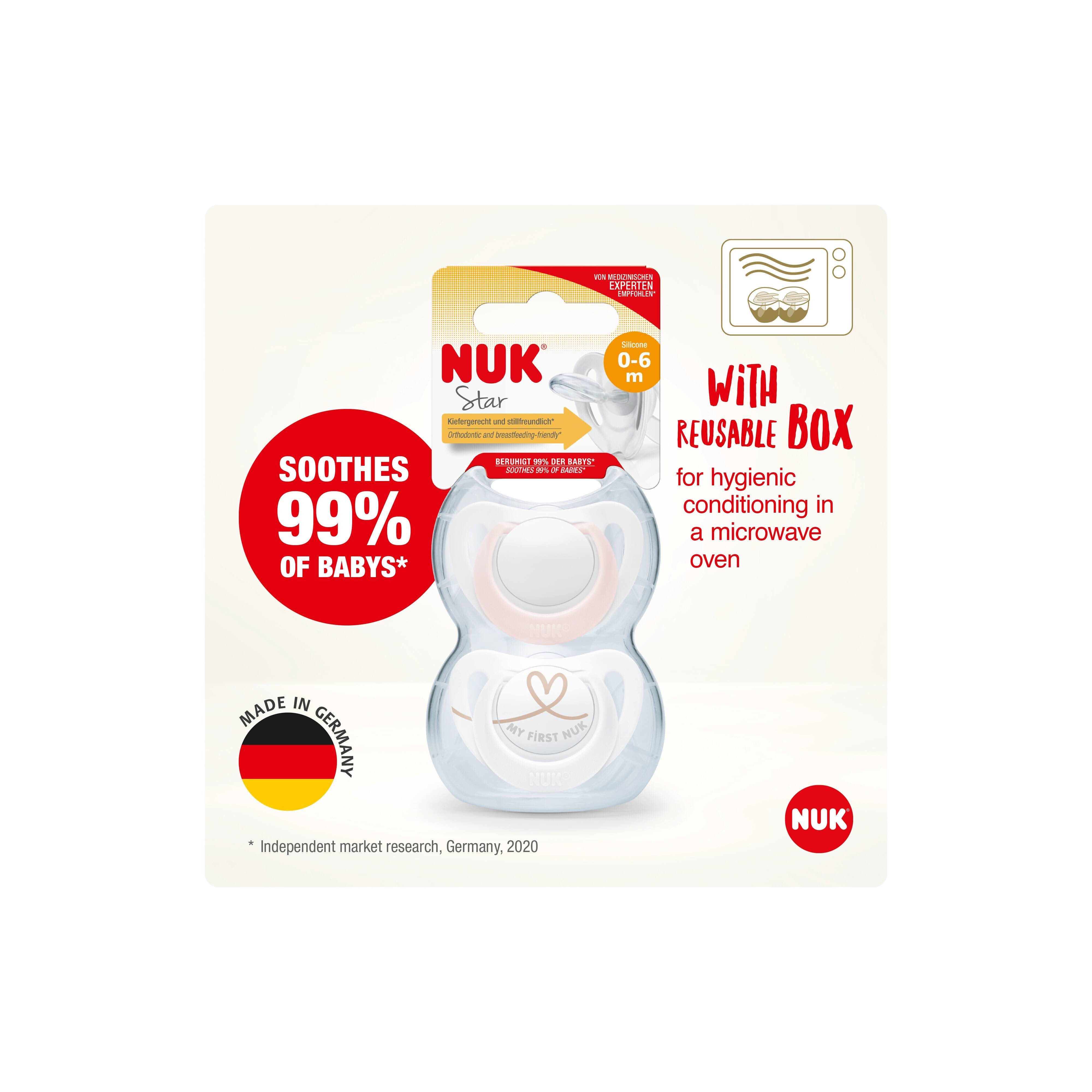 Isn't it great when there's something you can always rely on? The Nuk Star soother is just that. 99% of babies are soothed by it*. 96% of breastfeeding mothers appreciate that it's breastfeeding-friendly*. And more than 90% of orthodontists recommend it because of its jaw-friendly shape.* Unfortunately, babies can't explain why they love their Nuk Star so much. But we suspect it's because of the pleasant feeling in their mouths: the special soft zone on the upper side nestles very gently against the palate, while the underside of the Nuk Star leaves room for the tongue's natural sucking movements. And because it's very narrow and flat, hardly any pressure is exerted on the teeth or jaws.