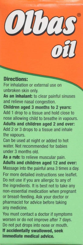 Olbas Oil is a mixture of essential pure plant oils for relief of bronchial and nasal congestion and hay fever by inhalation. Olbas Oil is suitable for adults and children as young as 3 months, though Olbas also has a gentler formulation especially developed for little noses – Olbas for Children, also suitable from 3 months. When applied to the skin, Olbas Oil can also relieve symptoms of muscular pain – this is not recommended for children under 12 years.