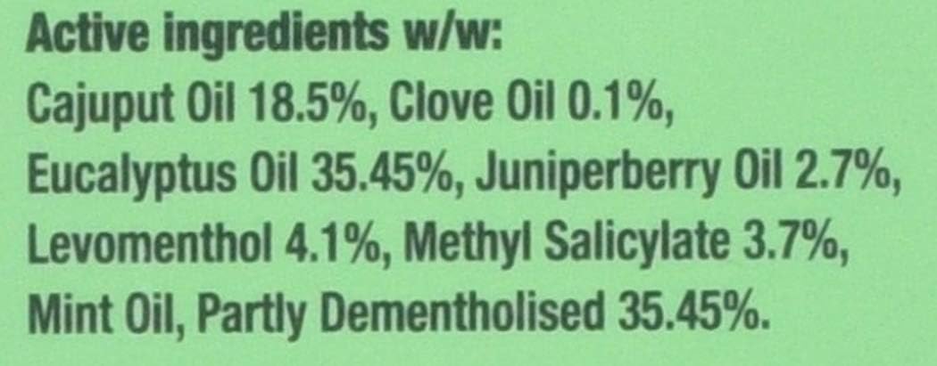 Cajuput Oil (18.5%)? Clove Oil (0.1%)? Eucalyptus Oil (35.45%)? Juniperberry Oil (2.7%)? Levomenthol (4.1%)? Methyl Salicylate (3.7%)? Mint Oil? Partly Dementholised (35.45%)