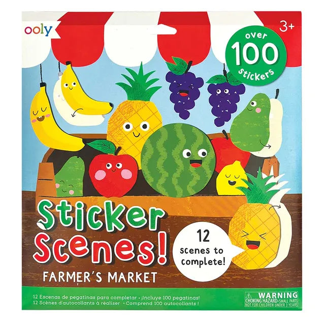 Create a scene at the farmer's market.It's all happening at the farmer's market, and now your kiddo gets to set the scene for themselves! This super fun activity will have your little one creating sticker scenes with chatty fruit, silly spreads, and feel-good flowers! The set includes over 100 stickers to be used to complete the kit's 12 scenes!