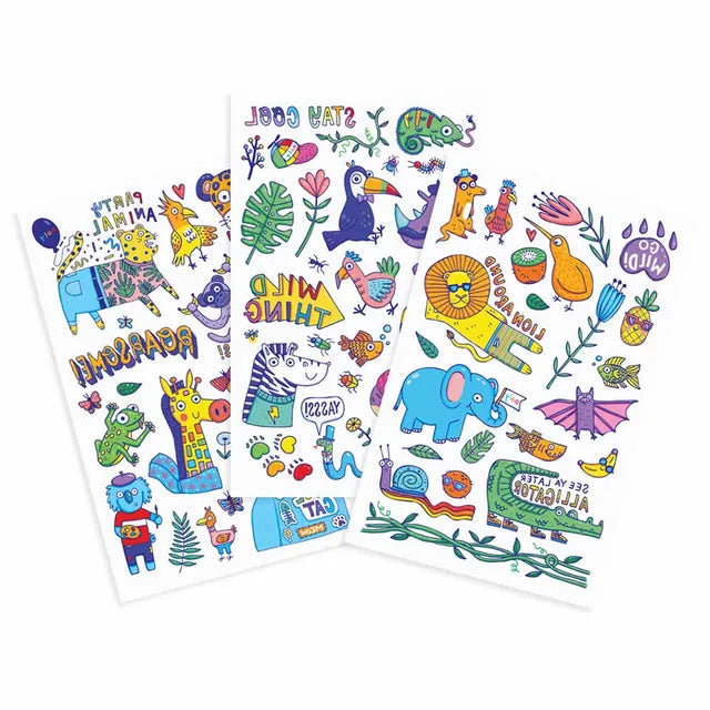 The Party Animal temporary tattoo set comes with 3 temporary tattoo sheets; that's over 50 tattoos in a set! , , This tattoo set is full of festive toucans, sloths, koalas and so much more. Tattoo-Paloozas are easy to apply and last up to 5 days and are easy to remove. Non-toxic.
