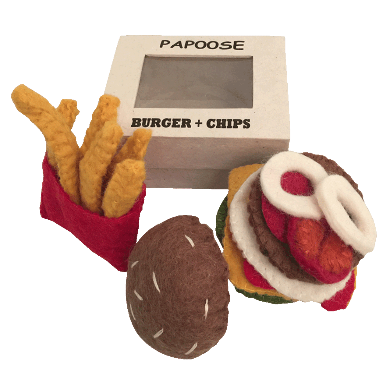 Whip up developmental play adventures with this inspiring, handmade Build Your Own Burger Set. Food is a familiar, often exciting concept for young children, so food toys are a natural for stimulating their imagination. As they play restaurant, pretend cook in the kitchen, and role-play a chef, children nurture a variety of skills: language, pre-writing, storytelling, and original thinking.