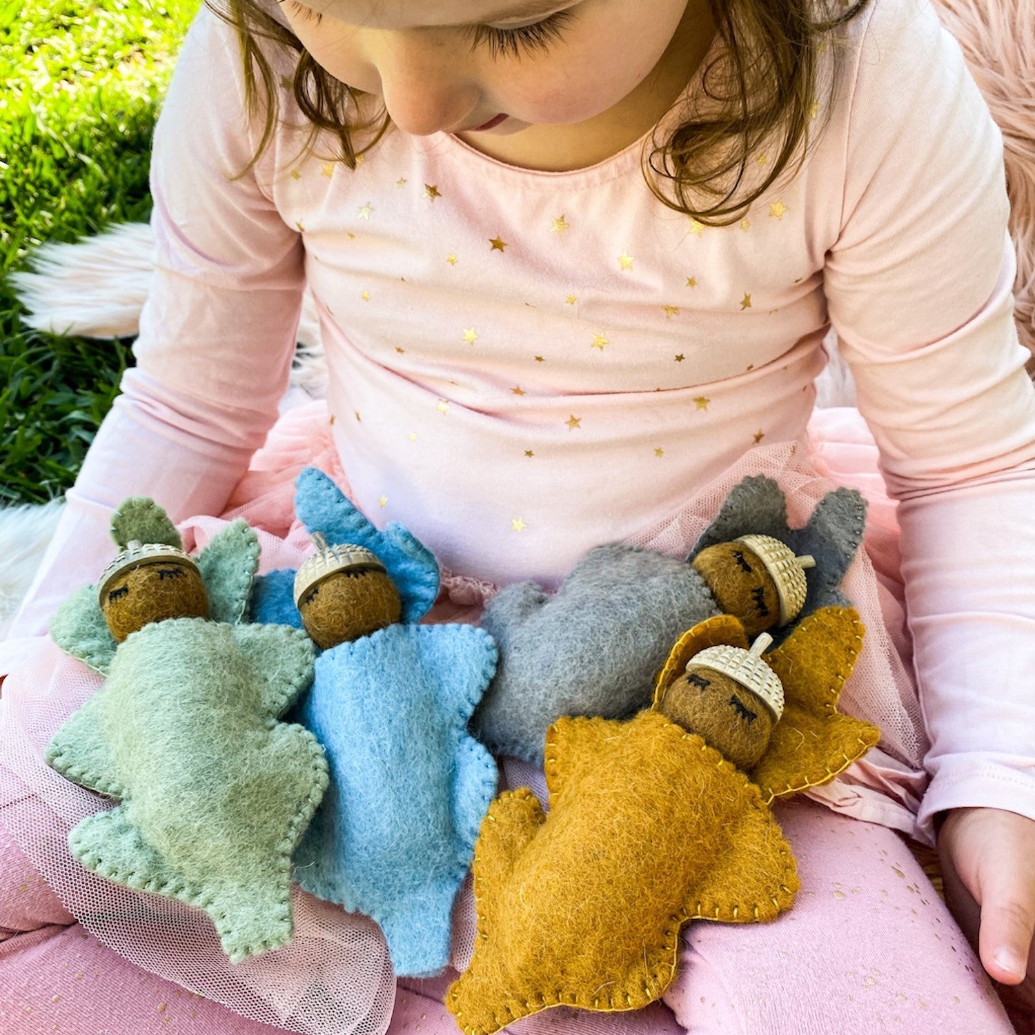 & little acorn babies snuggled up in their Oak Leaf bed. The body colours match the leaf colours.