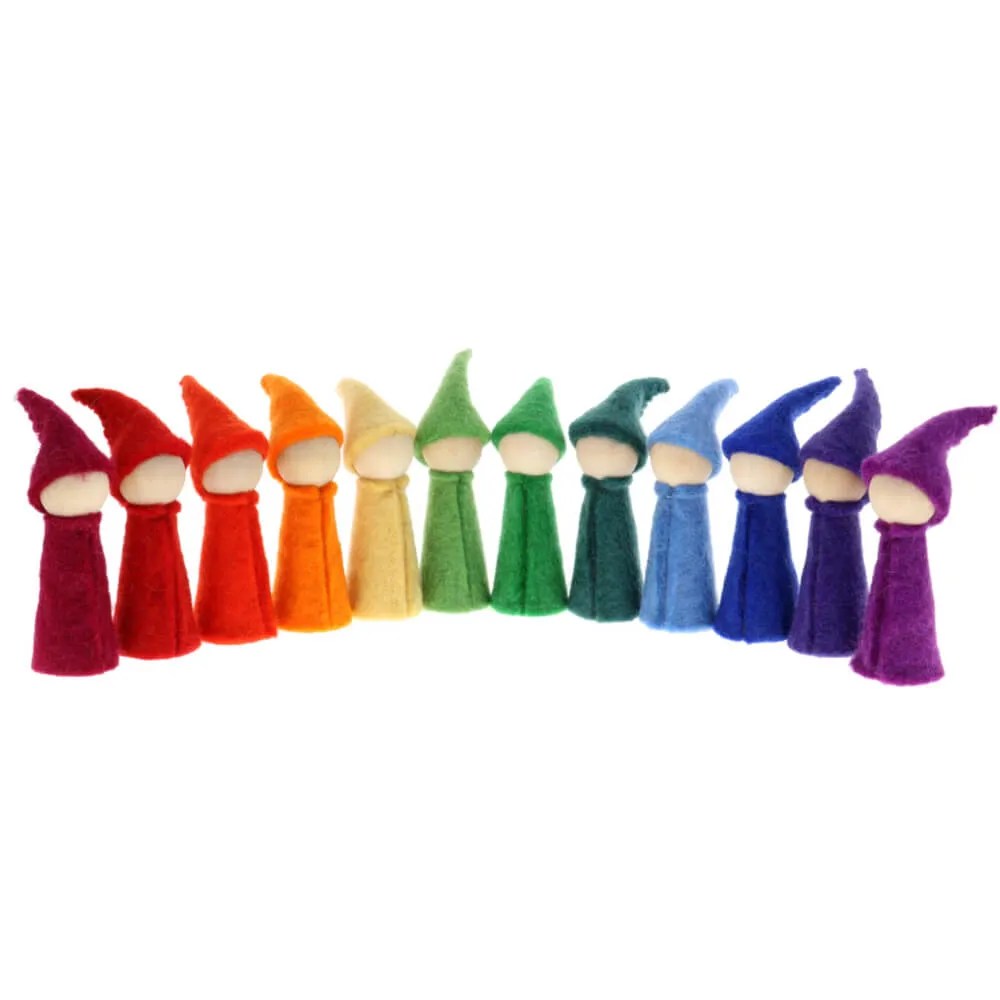 These little wooden people come in 12 different colours. These twelve wooden and felt gnomes are dressed in the 12 Goethe colours. These little gnomes can live anywhere and are a perfect addition to many small world play set ups.