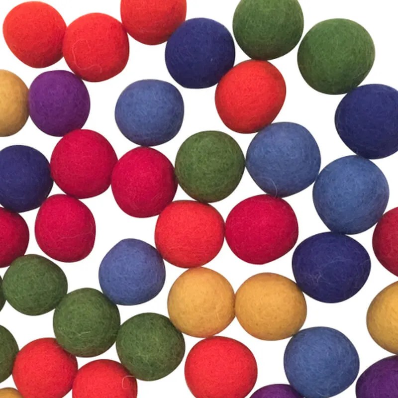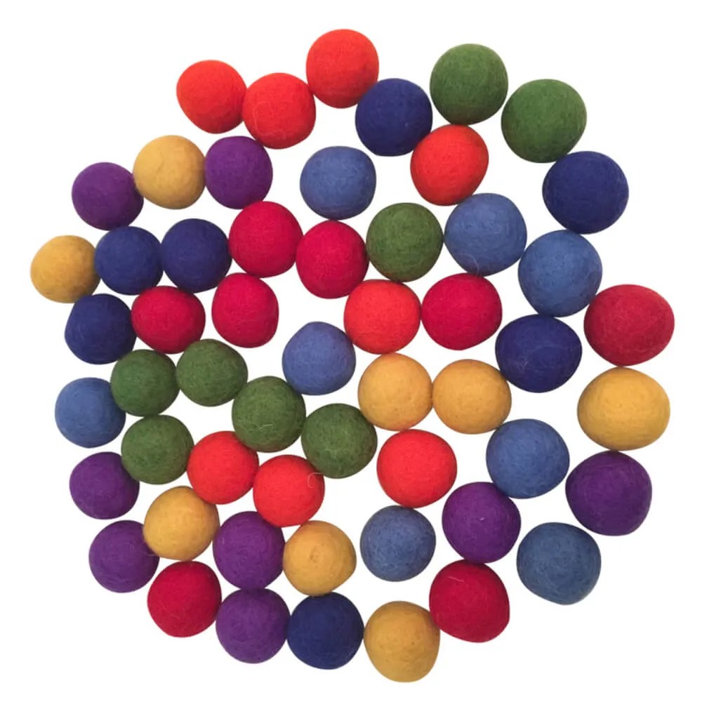 An assortment of 49 rainbow balls made from 100% wool felt. Soft wool balls for playing games, counting, sorting, and playing. Perfect for educating young minds about colours, numbers and math but also for all kinds of imaginative play.